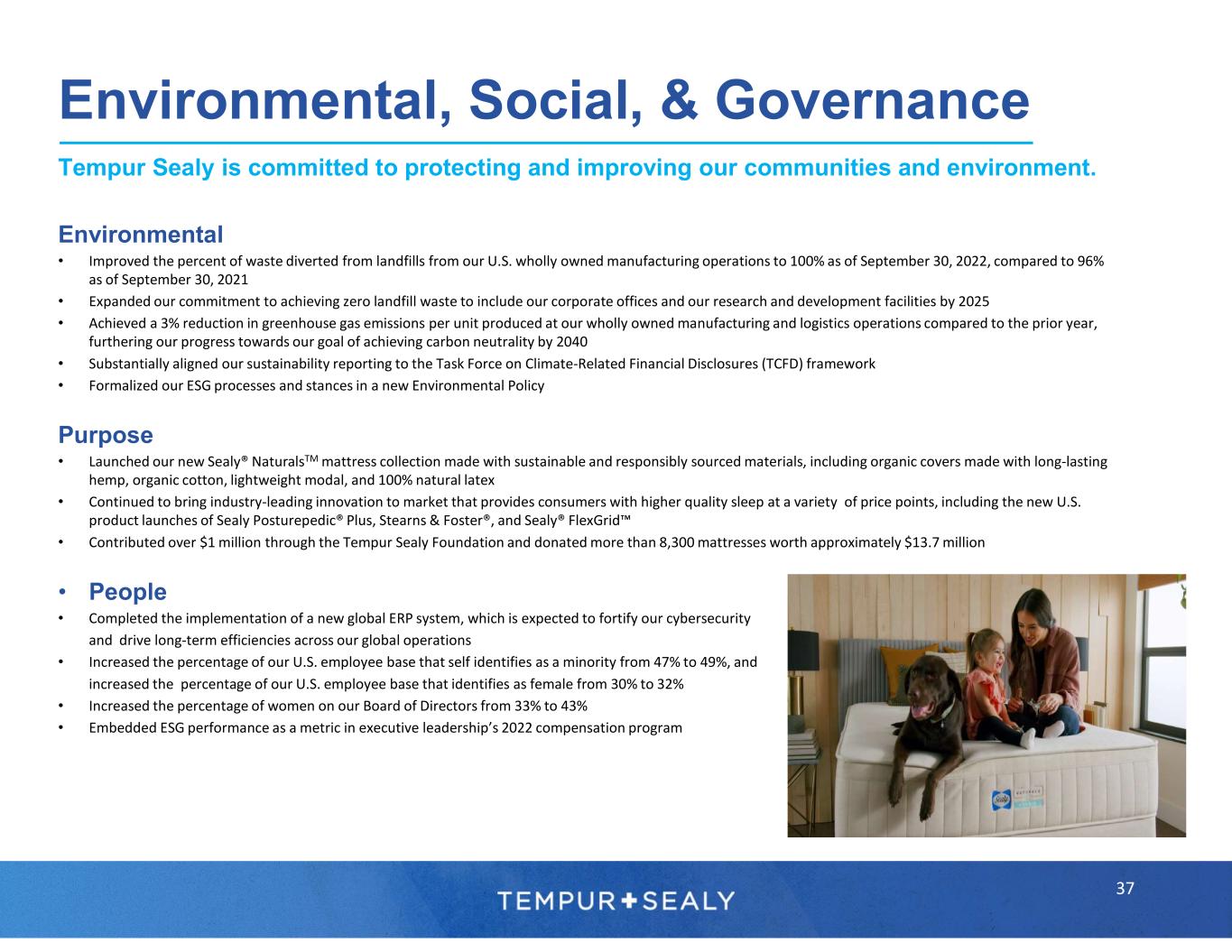 Environmental, Social, & Governance Tempur Sealy is committed to protecting and improving our communities and environment. 36