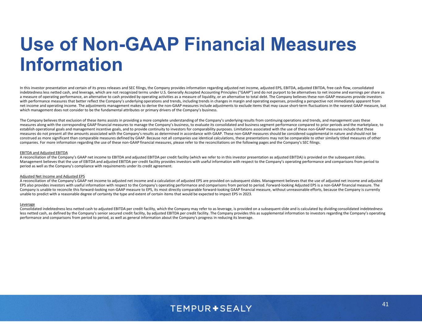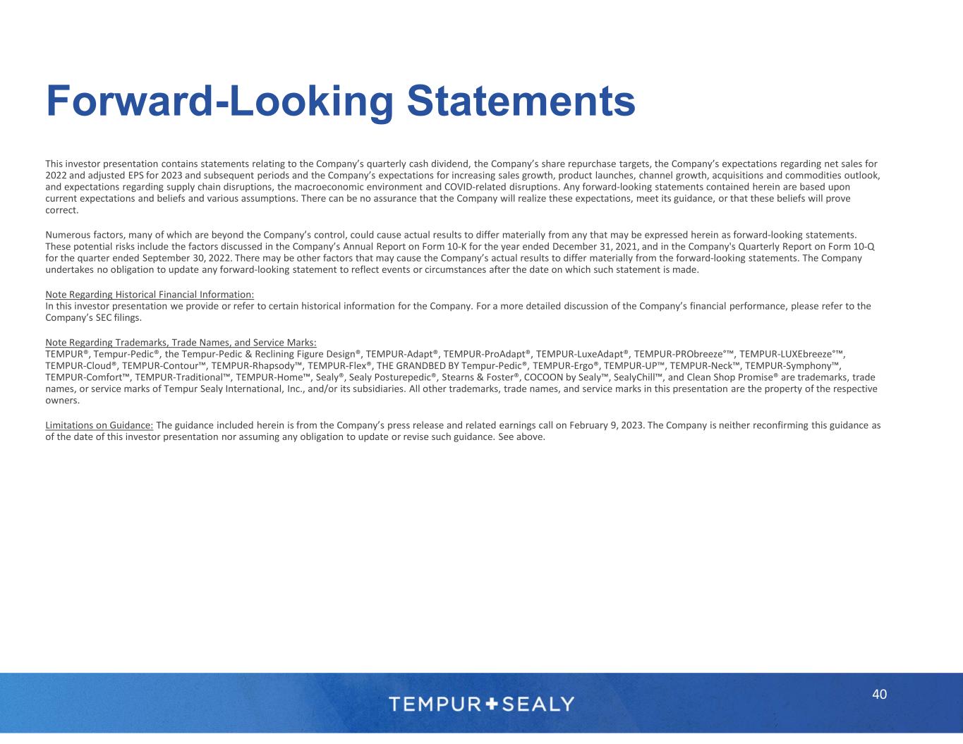 This investor presentation contains statements relating to the Company’s quarterly cash dividend, the Company’s share repurchase targets, the Company’s expectations regarding net sales for 2022 and adjusted EPS for 2023 and subsequent periods and the Company’s expectations for increasing sales growth, product launches, channel growth, acquisitions and commodities outlook, and expectations regarding supply chain disruptions, the macroeconomic environment and COVID-related disruptions. Any forward-looking statements contained herein are based upon current expectations and beliefs and various assumptions. There can be no assurance that the Company will realize these expectations, meet its guidance, or that these beliefs will prove correct. Numerous factors, many of which are beyond the Company’s control, could cause actual results to differ materially from any that may be expressed herein as forward-looking statements. These potential risks include the factors discussed in the Company’s Annual Report on Form 10-K for the year ended December 31, 2021, and in the Company's Quarterly Report on Form 10-Q for the quarter ended September 30, 2022. There may be other factors that may cause the Company’s actual results to differ materially from the forward-looking statements. The Company undertakes no obligation to update any forward-looking statement to reflect events or circumstances after the date on which such statement is made. Note Regarding Historical Financial Information: In this investor presentation we provide or refer to certain historical information for the Company. For a more detailed discussion of the Company’s financial performance, please refer to the Company’s SEC filings. Note Regarding Trademarks, Trade Names, and Service Marks: TEMPUR®, Tempur-Pedic®, the Tempur-Pedic & Reclining Figure Design®, TEMPUR-Adapt®, TEMPUR-ProAdapt®, TEMPUR-LuxeAdapt®, TEMPUR-PRObreeze°™, TEMPUR-LUXEbreeze°™, TEMPUR-Cloud®, TEMPUR-Contour™, TEMPUR-Rhapsody™, TEMPUR-Flex®, THE GRANDBED BY Tempur-Pedic®, TEMPUR-Ergo®, TEMPUR-UP™, TEMPUR-Neck™, TEMPUR-Symphony™, TEMPUR-Comfort™, TEMPUR-Traditional™, TEMPUR-Home™, Sealy®, Sealy Posturepedic®, Stearns & Foster®, COCOON by Sealy™, SealyChill™, and Clean Shop Promise® are trademarks, trade names, or service marks of Tempur Sealy International, Inc., and/or its subsidiaries. All other trademarks, trade names, and service marks in this presentation are the property of the respective owners. Limitations on Guidance: The guidance included herein is from the Company’s press release and related earnings call on February 9, 2023. The Company is neither reconfirming this guidance as of the date of this investor presentation nor assuming any obligation to update or revise such guidance. See above. Forward-Looking Statements 40