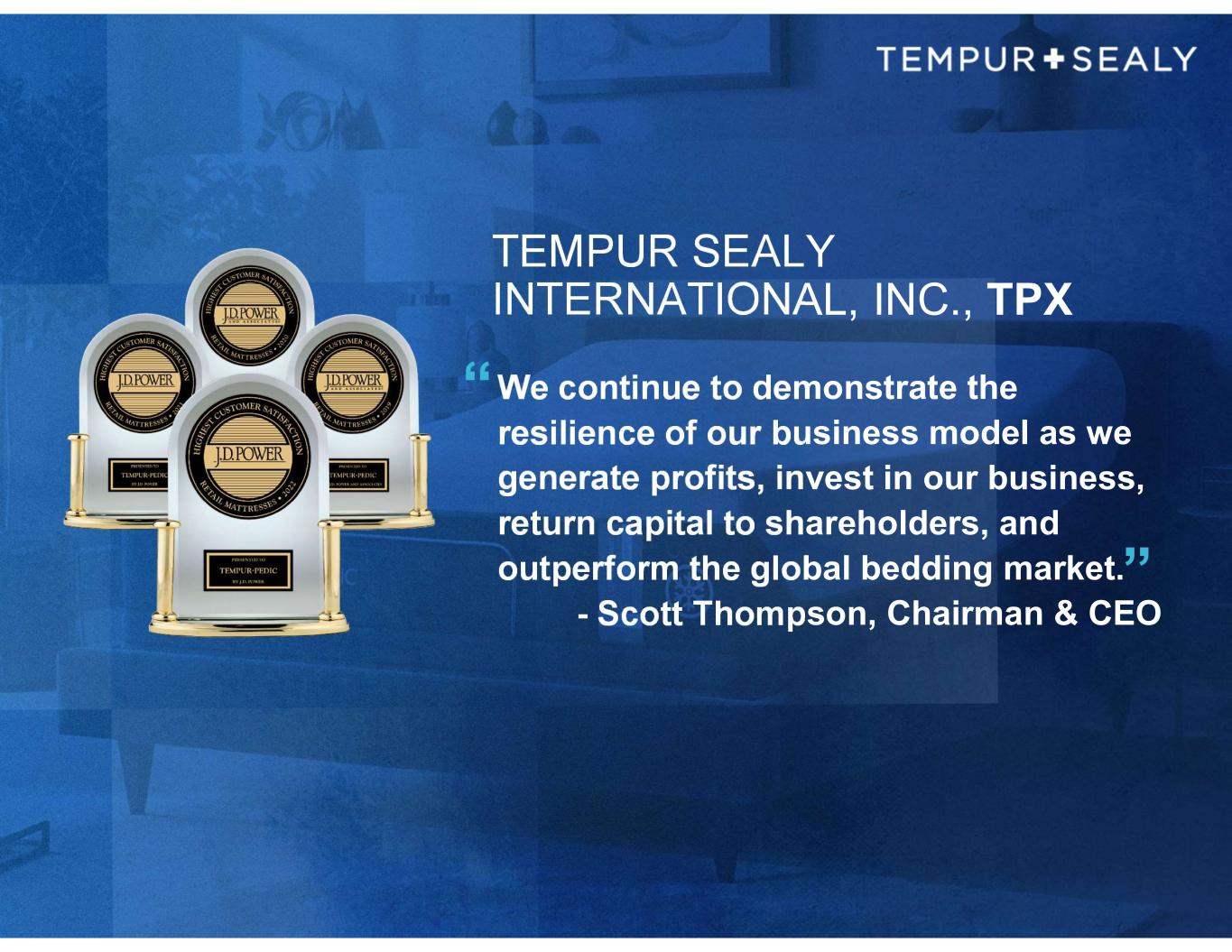 We continue to demonstrate the resilience of our business model as we generate profits, invest in our business, return capital to shareholders, and outperform the global bedding market. - Scott Thompson, Chairman & CEO TEMPUR SEALY INTERNATIONAL, INC., TPX “ “