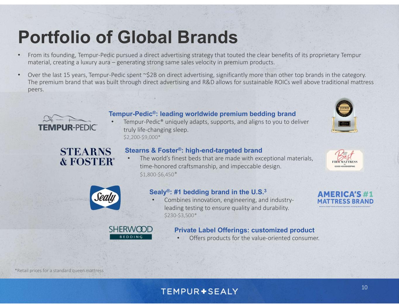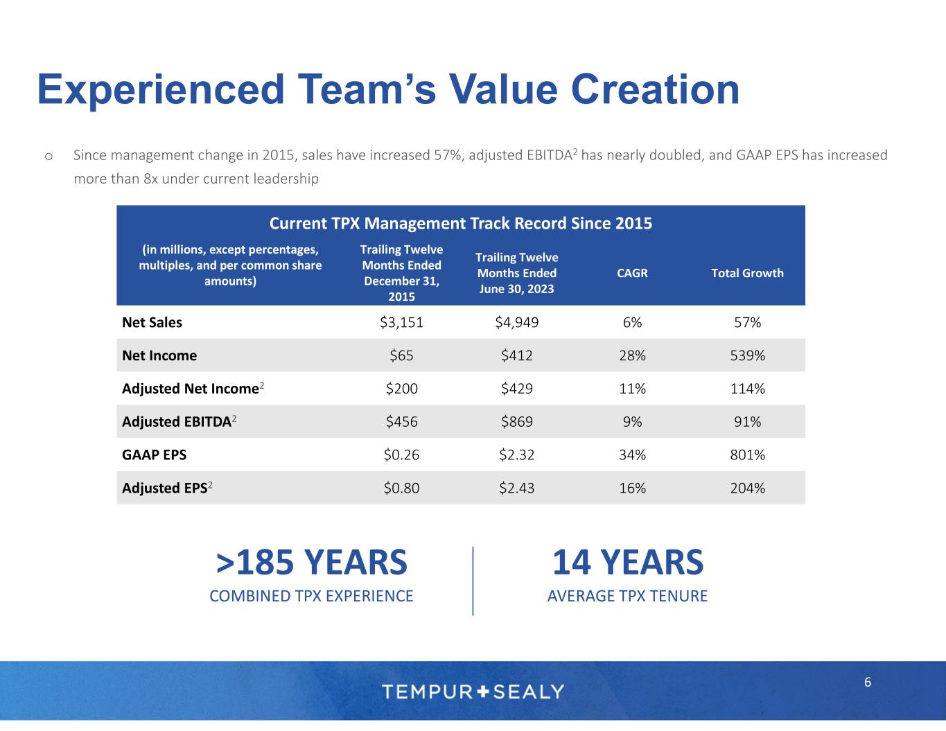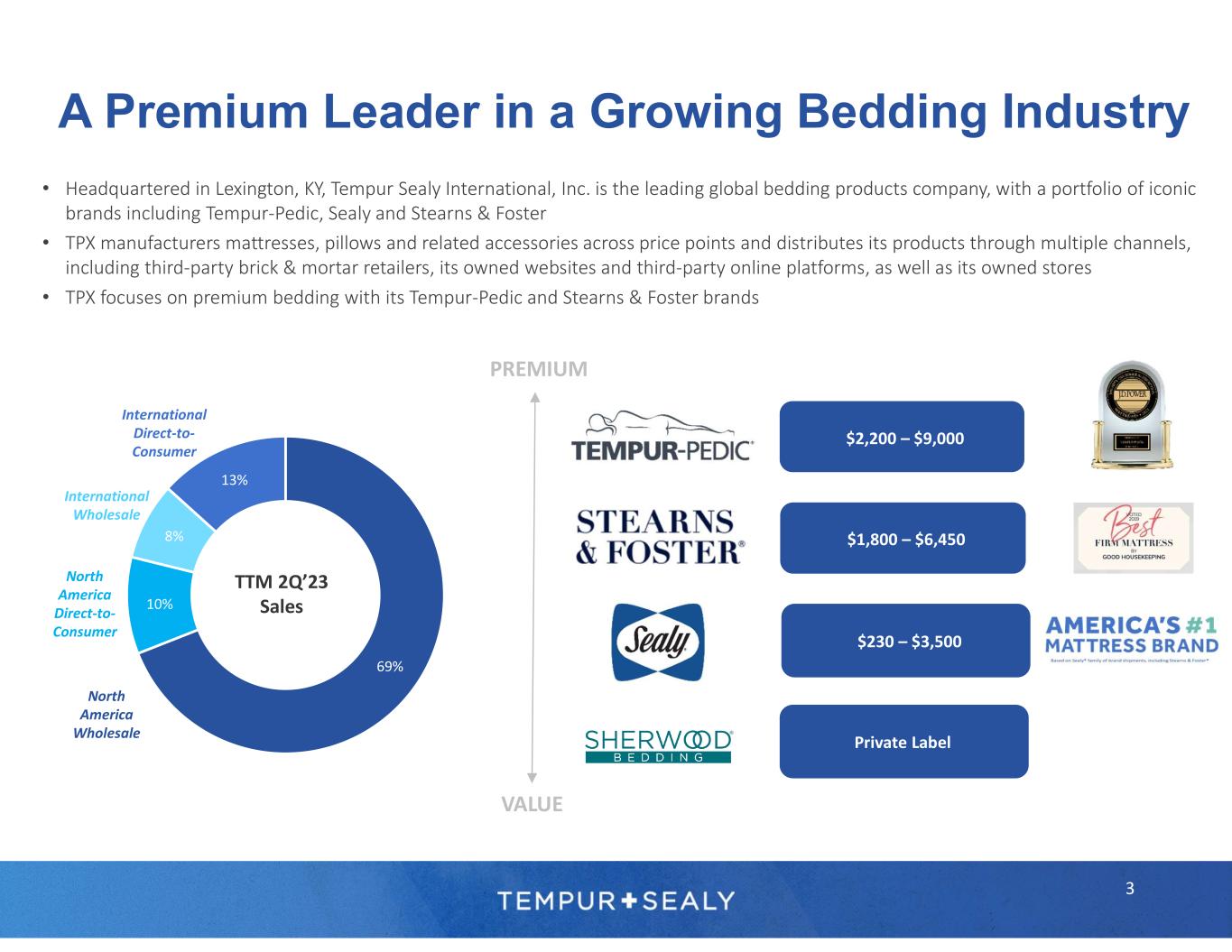 TPX Go-Forward Investment Thesis Leading, vertically-integrated global company with iconic brands and extensive manufacturing and direct-to-consumer capabilities Proven historical growth through organic and inorganic initiatives Proven ability to successfully operate worldwide omni- channel distribution Legacy of disciplined capital allocation, including dividends, share repurchases, and acquisitions Seasoned, well-aligned management team with track record of success Serves $120 billion1 growing bedding market