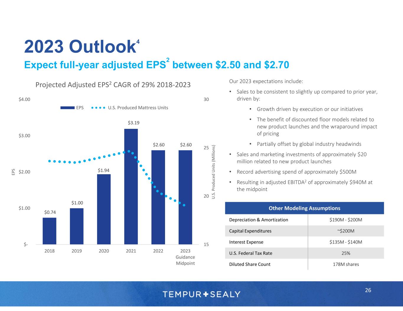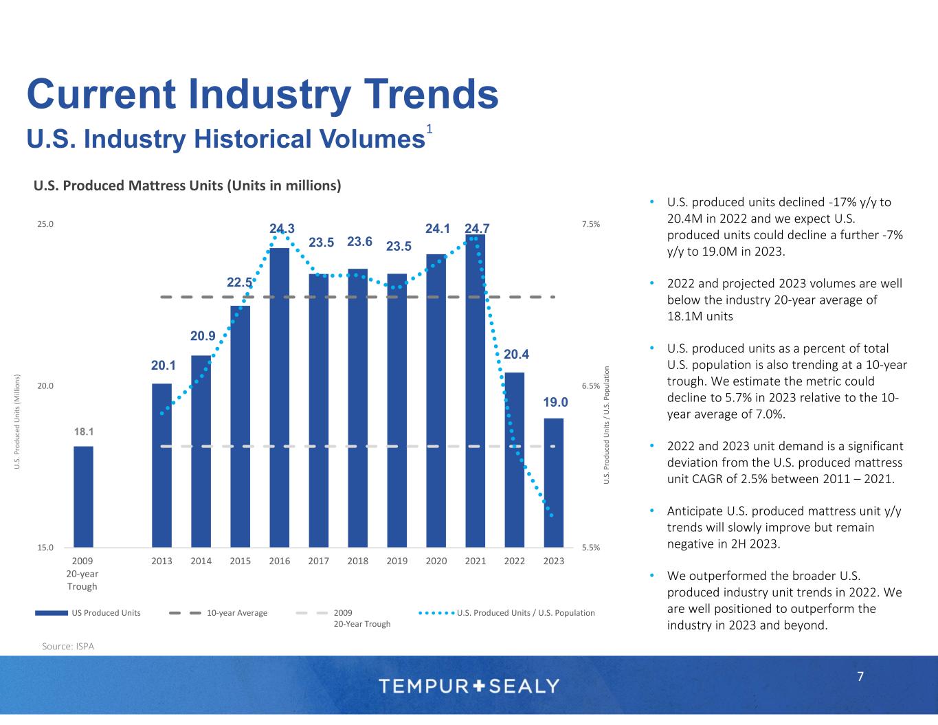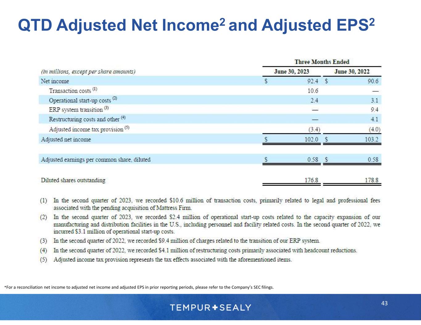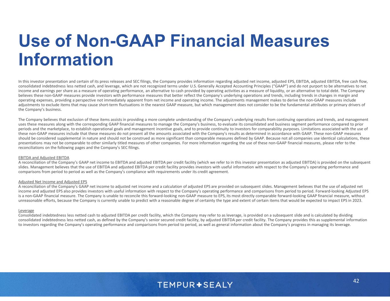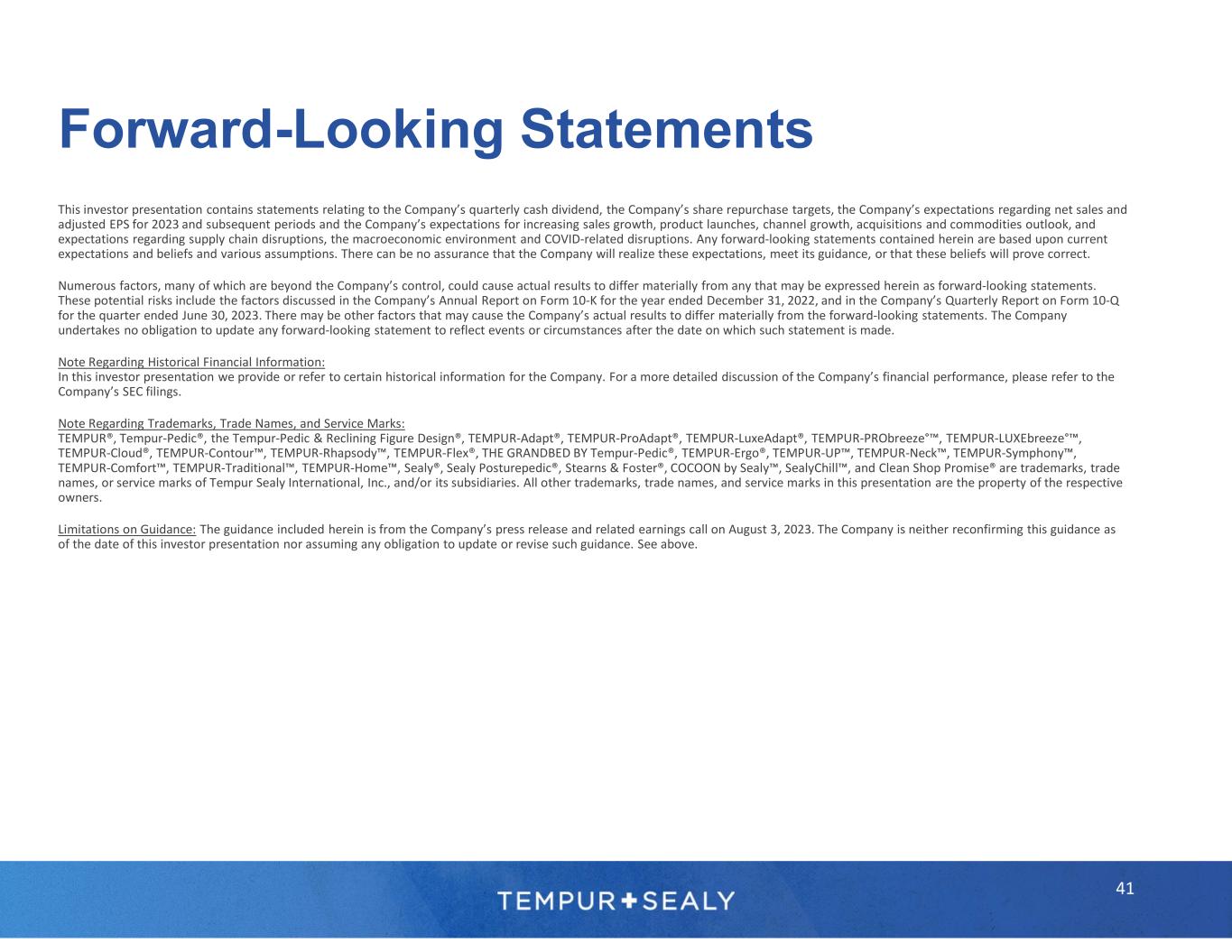 This investor presentation contains statements relating to the Company’s quarterly cash dividend, the Company’s share repurchase targets, the Company’s expectations regarding net sales and adjusted EPS for 2023 and subsequent periods and the Company’s expectations for increasing sales growth, product launches, channel growth, acquisitions and commodities outlook, and expectations regarding supply chain disruptions, the macroeconomic environment and COVID-related disruptions. Any forward-looking statements contained herein are based upon current expectations and beliefs and various assumptions. There can be no assurance that the Company will realize these expectations, meet its guidance, or that these beliefs will prove correct. Numerous factors, many of which are beyond the Company’s control, could cause actual results to differ materially from any that may be expressed herein as forward-looking statements. These potential risks include the factors discussed in the Company’s Annual Report on Form 10-K for the year ended December 31, 2022, and in the Company’s Quarterly Report on Form 10-Q for the quarter ended June 30, 2023. There may be other factors that may cause the Company’s actual results to differ materially from the forward-looking statements. The Company undertakes no obligation to update any forward-looking statement to reflect events or circumstances after the date on which such statement is made. Note Regarding Historical Financial Information: In this investor presentation we provide or refer to certain historical information for the Company. For a more detailed discussion of the Company’s financial performance, please refer to the Company’s SEC filings. Note Regarding Trademarks, Trade Names, and Service Marks: TEMPUR®, Tempur-Pedic®, the Tempur-Pedic & Reclining Figure Design®, TEMPUR-Adapt®, TEMPUR-ProAdapt®, TEMPUR-LuxeAdapt®, TEMPUR-PRObreeze°™, TEMPUR-LUXEbreeze°™, TEMPUR-Cloud®, TEMPUR-Contour™, TEMPUR-Rhapsody™, TEMPUR-Flex®, THE GRANDBED BY Tempur-Pedic®, TEMPUR-Ergo®, TEMPUR-UP™, TEMPUR-Neck™, TEMPUR-Symphony™, TEMPUR-Comfort™, TEMPUR-Traditional™, TEMPUR-Home™, Sealy®, Sealy Posturepedic®, Stearns & Foster®, COCOON by Sealy™, SealyChill™, and Clean Shop Promise® are trademarks, trade names, or service marks of Tempur Sealy International, Inc., and/or its subsidiaries. All other trademarks, trade names, and service marks in this presentation are the property of the respective owners. Limitations on Guidance: The guidance included herein is from the Company’s press release and related earnings call on August 3, 2023. The Company is neither reconfirming this guidance as of the date of this investor presentation nor assuming any obligation to update or revise such guidance. See above. Forward-Looking Statements 41