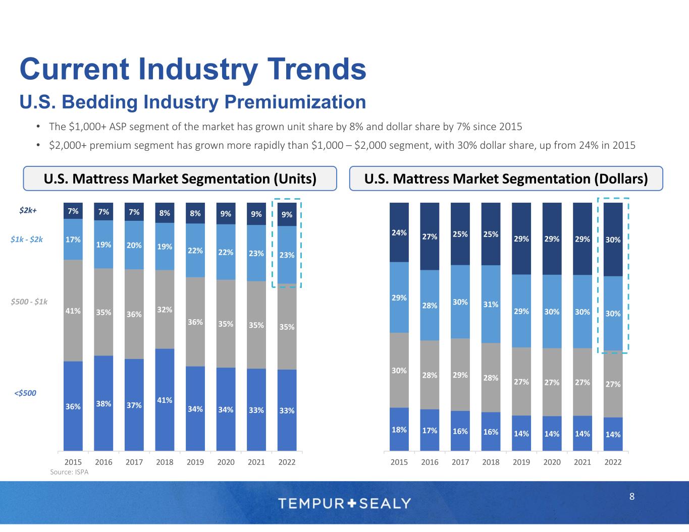 • U.S. produced units declined -17% y/y to 20.4M in 2022 and we expect U.S. produced units could decline a further -7% y/y to 19.0M in 2023. • 2022 and projected 2023 volumes are well below the industry 20-year average of 18.1M units • U.S. produced units as a percent of total U.S. population is also trending at a 10-year trough. We estimate the metric could decline to 5.7% in 2023 relative to the 10- year average of 7.0%. • 2022 and 2023 unit demand is a significant deviation from the U.S. produced mattress unit CAGR of 2.5% between 2011 – 2021. • Anticipate U.S. produced mattress unit y/y trends will slowly improve but remain negative in 2H 2023. • We outperformed the broader U.S. produced industry unit trends in 2022. We are well positioned to outperform the industry in 2023 and beyond. U.S. Produced Mattress Units (Units in millions) Current Industry Trends U.S. Industry Historical Volumes 1 7 Source: ISPA 18.1 20.1 20.9 22.5 24.3 23.5 23.6 23.5 24.1 24.7 20.4 19.0 5.5% 6.5% 7.5% 15.0 20.0 25.0 2009 20-year Trough 2013 2014 2015 2016 2017 2018 2019 2020 2021 2022 2023 U .S . P ro du ce d U ni ts / U .S . P op ul at io n U .S . P ro du ce d U ni ts (M ill io ns ) US Produced Units 10-year Average 2009 20-Year Trough U.S. Produced Units / U.S. Population