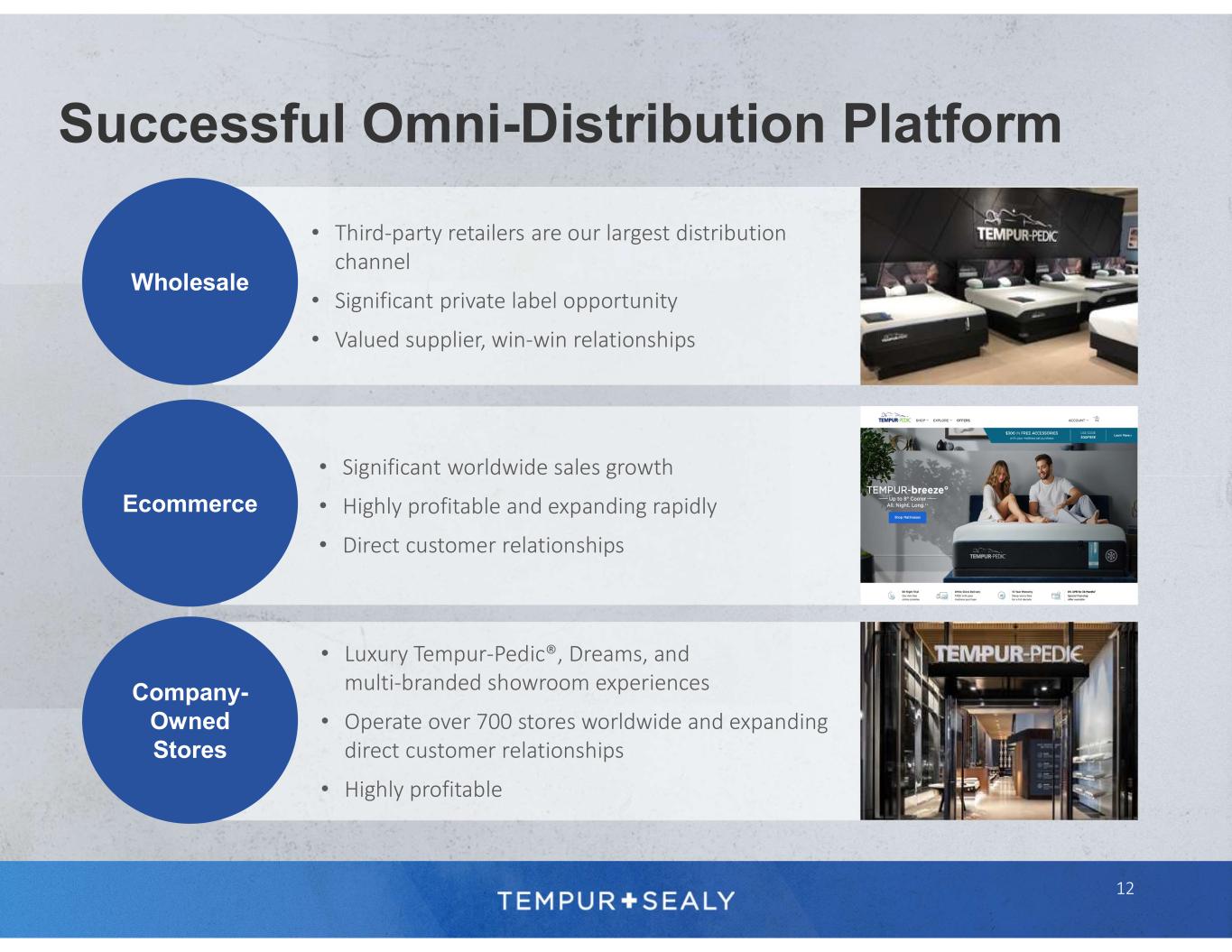 Leading Manufacturing Capabilities • 71 manufacturing facilities • 16 million square feet of manufacturing & distribution operations R&D Innovation • 75,000 square feet of research & development • 4 state-of-the art product-testing locations Wholly owned (32) Joint Venture (8) Licensee (27)Tempur-Pedic® Facility (4) World-Class Manufacturing Capabilities 34 NORTH AMERICAN FACILITIES | 37 INTERNATIONAL FACILITIES Albuquerque, NM 11