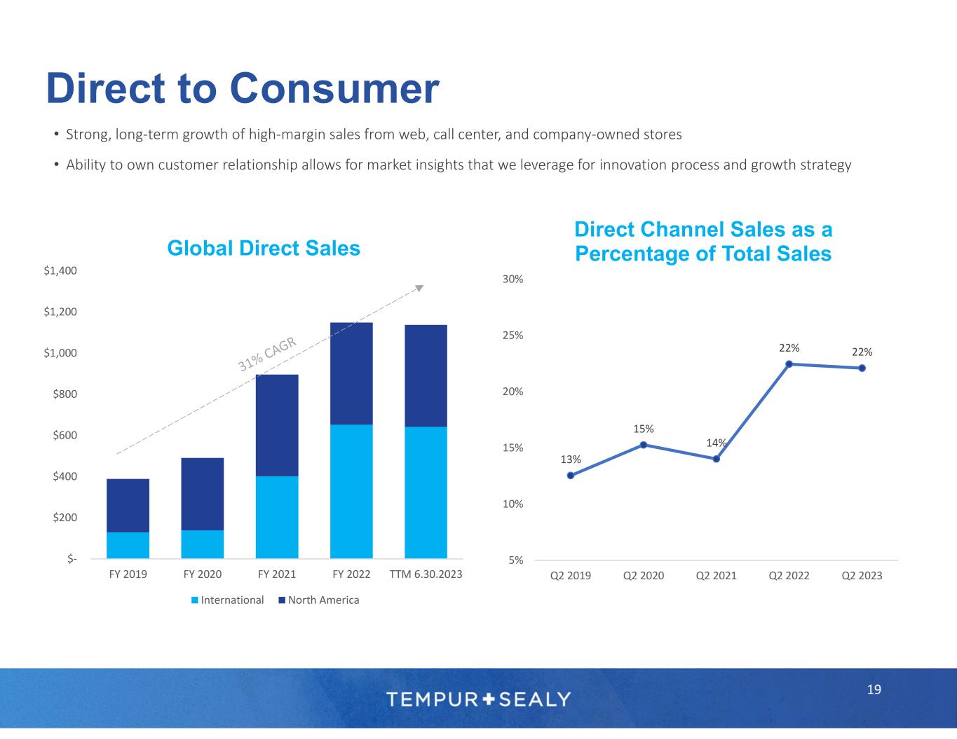 18 With more than 175 years of history, Stearns & Foster is positioned to become the luxury leader in innerspring beds. We have several initiatives underway with an objective of more than doubling Stearns & Foster to be our next billion- dollar brand • We are launching an all-new collection of Stearns & Foster products in 2023. This updated portfolio features superior innovation, an elevated design and enhanced step-up opportunities, all intended to further differentiate Stearns & Foster. • After years of no direct advertising, we supported Stearns & Foster with record advertising in 2022 and continued investments in 2023. These campaigns are designed to increase consumer awareness and desire to purchase a premium innerspring mattress. • We have meaningfully expanded Stearns & Foster’s omni-channel presence through 20% slot growth at third-party retailers in 2023, combined with the expansion of Stearns & Foster into DTC e-commerce in late 2022. Stearns & Foster Opportunity Dual-Approach to Luxury Bedding Leading Luxury Specialty Foam Brand Portfolio Midpoint $3,650* Leading Luxury Innerspring Brand Portfolio Midpoint $3,300* <$500 M $1,000 M 2022 Opportunity1 *Retail prices for a standard queen mattress