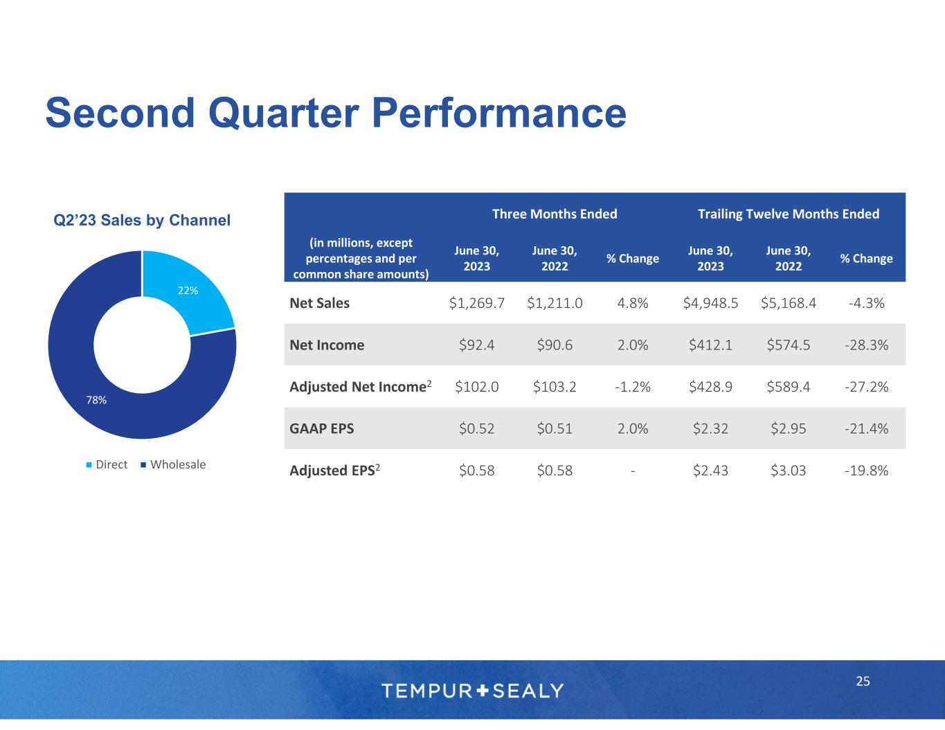 Three Months Ended Trailing Twelve Months Ended (in millions, except percentages and per common share amounts) June 30, 2023 June 30, 2022 % Change June 30, 2023 June 30, 2022 % Change Net Sales $1,269.7 $1,211.0 4.8% $4,948.5 $5,168.4 -4.3% Net Income $92.4 $90.6 2.0% $412.1 $574.5 -28.3% Adjusted Net Income2 $102.0 $103.2 -1.2% $428.9 $589.4 -27.2% GAAP EPS $0.52 $0.51 2.0% $2.32 $2.95 -21.4% Adjusted EPS2 $0.58 $0.58 - $2.43 $3.03 -19.8% Second Quarter Performance 25 Q2’23 Sales by Channel 22% 78% Direct Wholesale