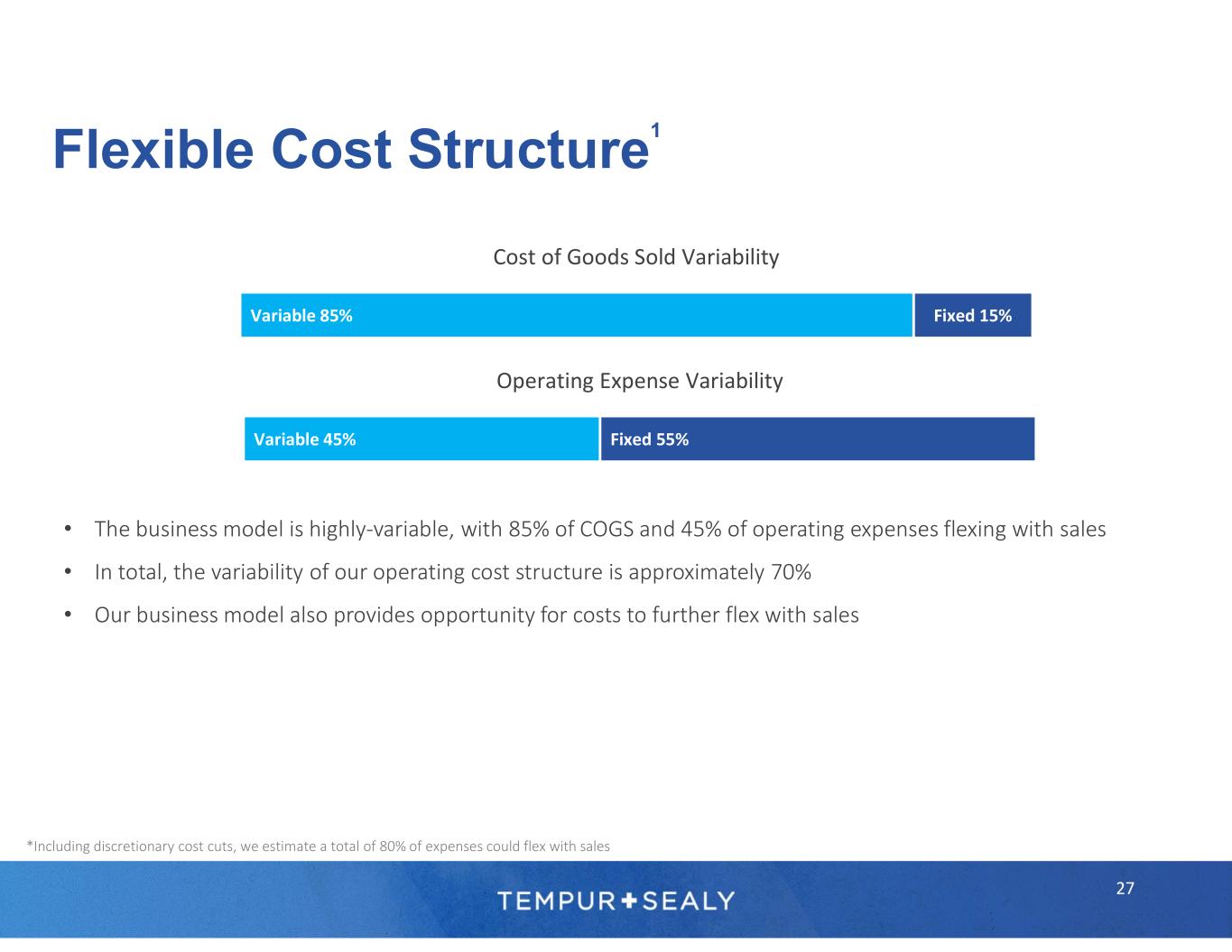 Flexible Cost Structure 1 27 • The business model is highly-variable, with 85% of COGS and 45% of operating expenses flexing with sales • In total, the variability of our operating cost structure is approximately 70% • Our business model also provides opportunity for costs to further flex with sales Variable 85% Fixed 15% Cost of Goods Sold Variability Variable 45% Fixed 55% Operating Expense Variability *Including discretionary cost cuts, we estimate a total of 80% of expenses could flex with sales