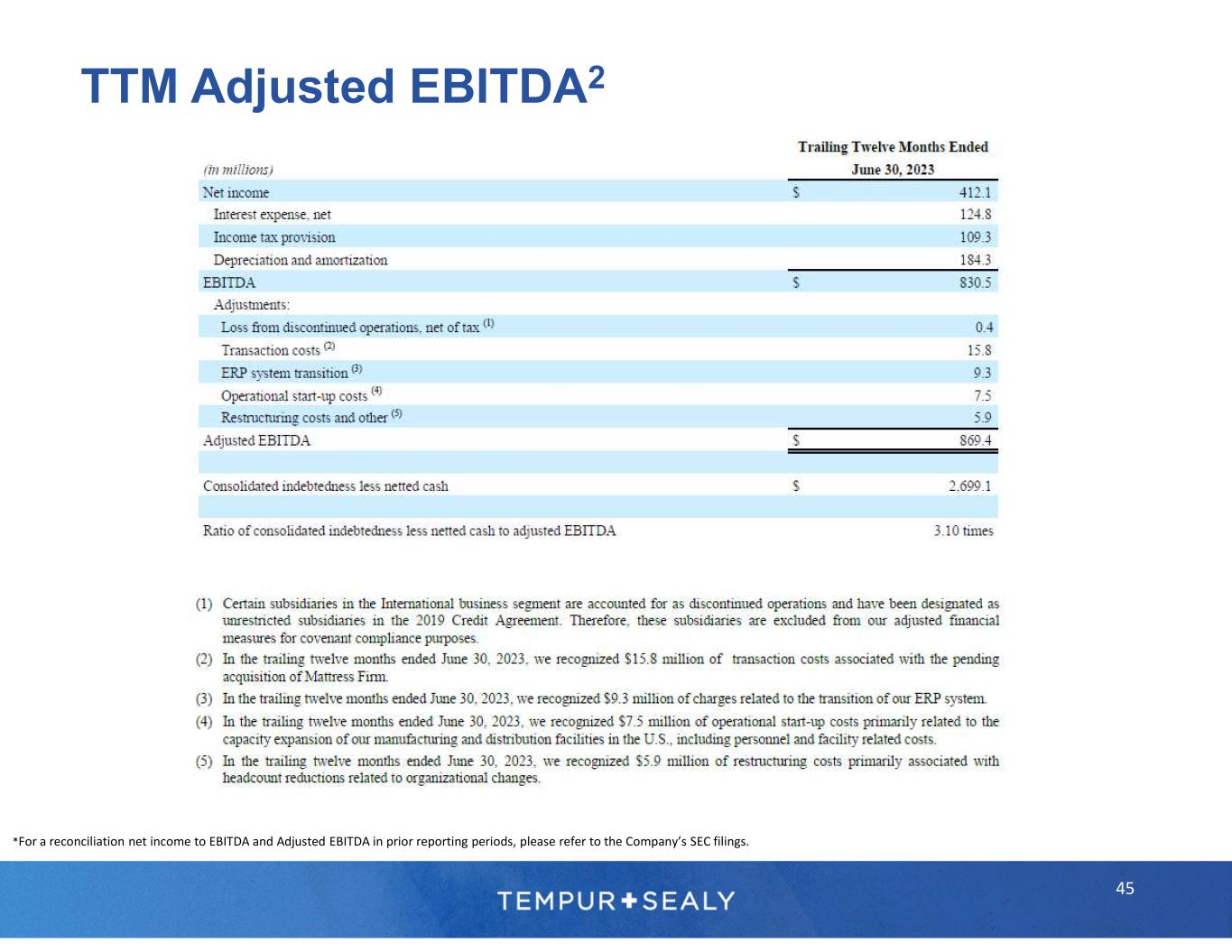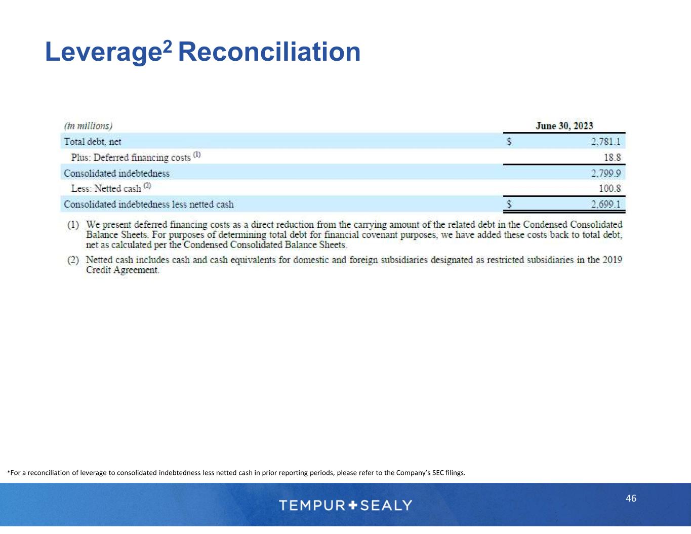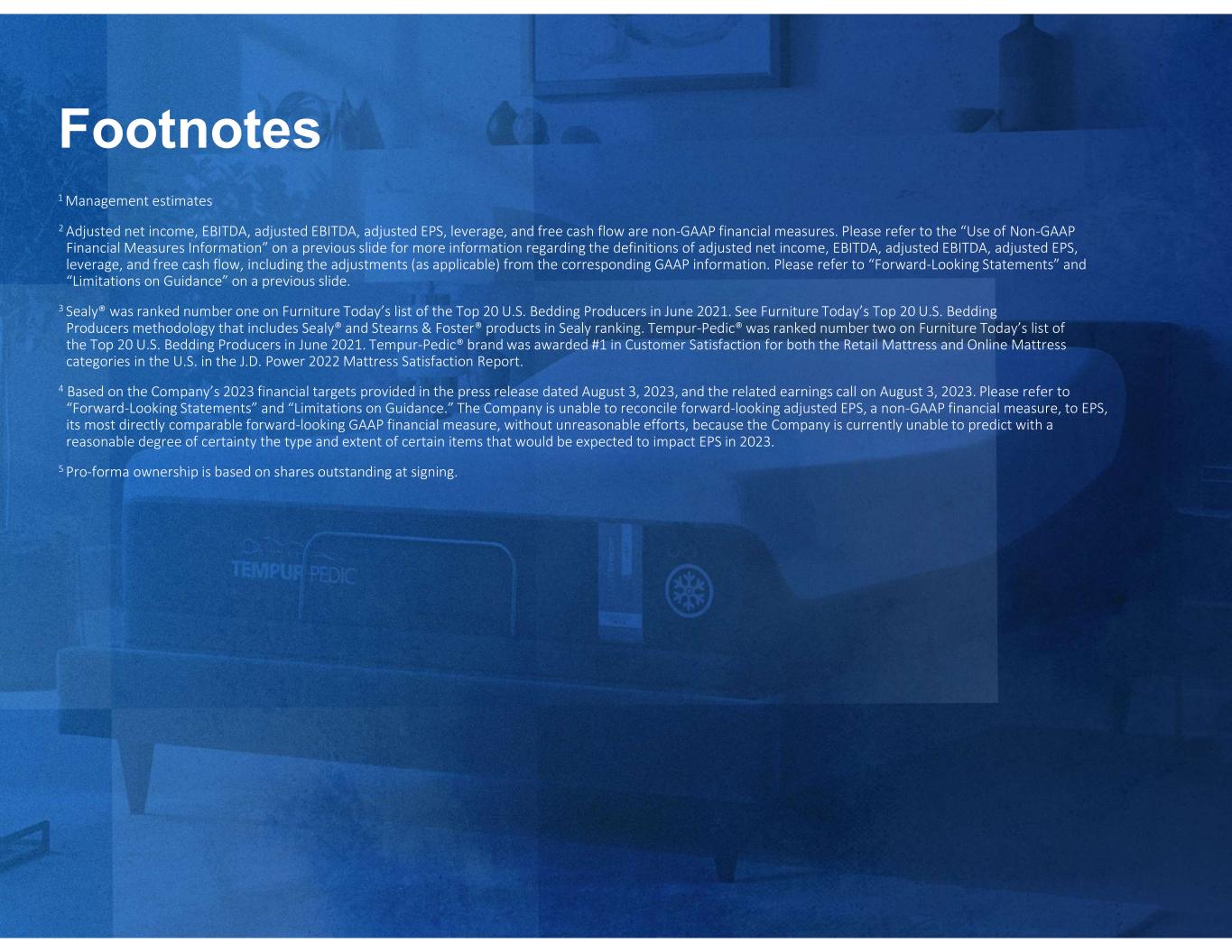 1 Management estimates 2 Adjusted net income, EBITDA, adjusted EBITDA, adjusted EPS, leverage, and free cash flow are non-GAAP financial measures. Please refer to the “Use of Non-GAAP Financial Measures Information” on a previous slide for more information regarding the definitions of adjusted net income, EBITDA, adjusted EBITDA, adjusted EPS, leverage, and free cash flow, including the adjustments (as applicable) from the corresponding GAAP information. Please refer to “Forward-Looking Statements” and “Limitations on Guidance” on a previous slide. 3 Sealy® was ranked number one on Furniture Today’s list of the Top 20 U.S. Bedding Producers in June 2021. See Furniture Today’s Top 20 U.S. Bedding Producers methodology that includes Sealy® and Stearns & Foster® products in Sealy ranking. Tempur-Pedic® was ranked number two on Furniture Today’s list of the Top 20 U.S. Bedding Producers in June 2021. Tempur-Pedic® brand was awarded #1 in Customer Satisfaction for both the Retail Mattress and Online Mattress categories in the U.S. in the J.D. Power 2022 Mattress Satisfaction Report. 4 Based on the Company’s 2023 financial targets provided in the press release dated August 3, 2023, and the related earnings call on August 3, 2023. Please refer to “Forward-Looking Statements” and “Limitations on Guidance.” The Company is unable to reconcile forward-looking adjusted EPS, a non-GAAP financial measure, to EPS, its most directly comparable forward-looking GAAP financial measure, without unreasonable efforts, because the Company is currently unable to predict with a reasonable degree of certainty the type and extent of certain items that would be expected to impact EPS in 2023. 5 Pro-forma ownership is based on shares outstanding at signing. Footnotes