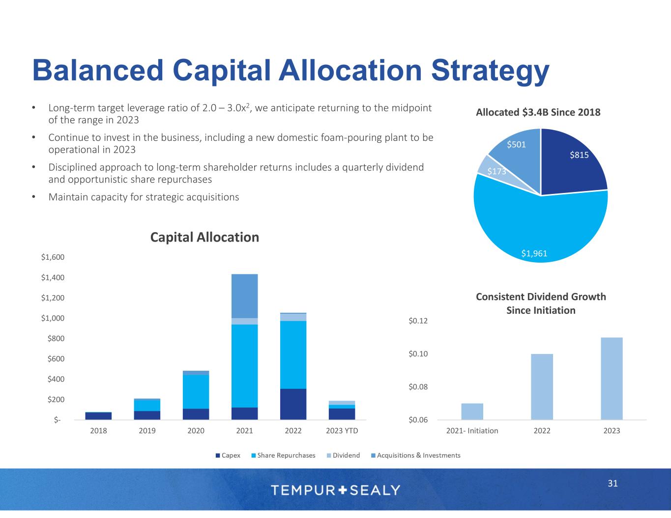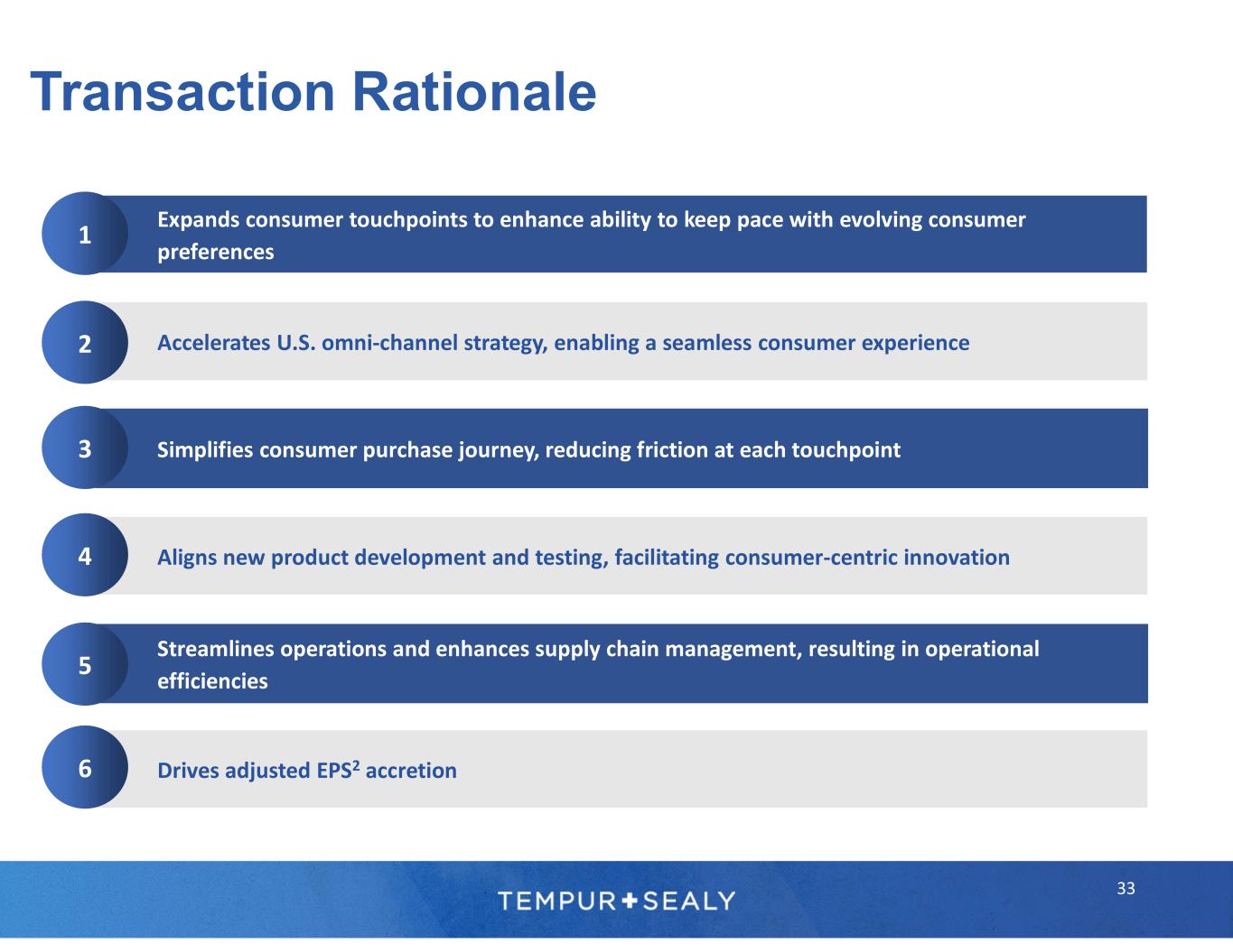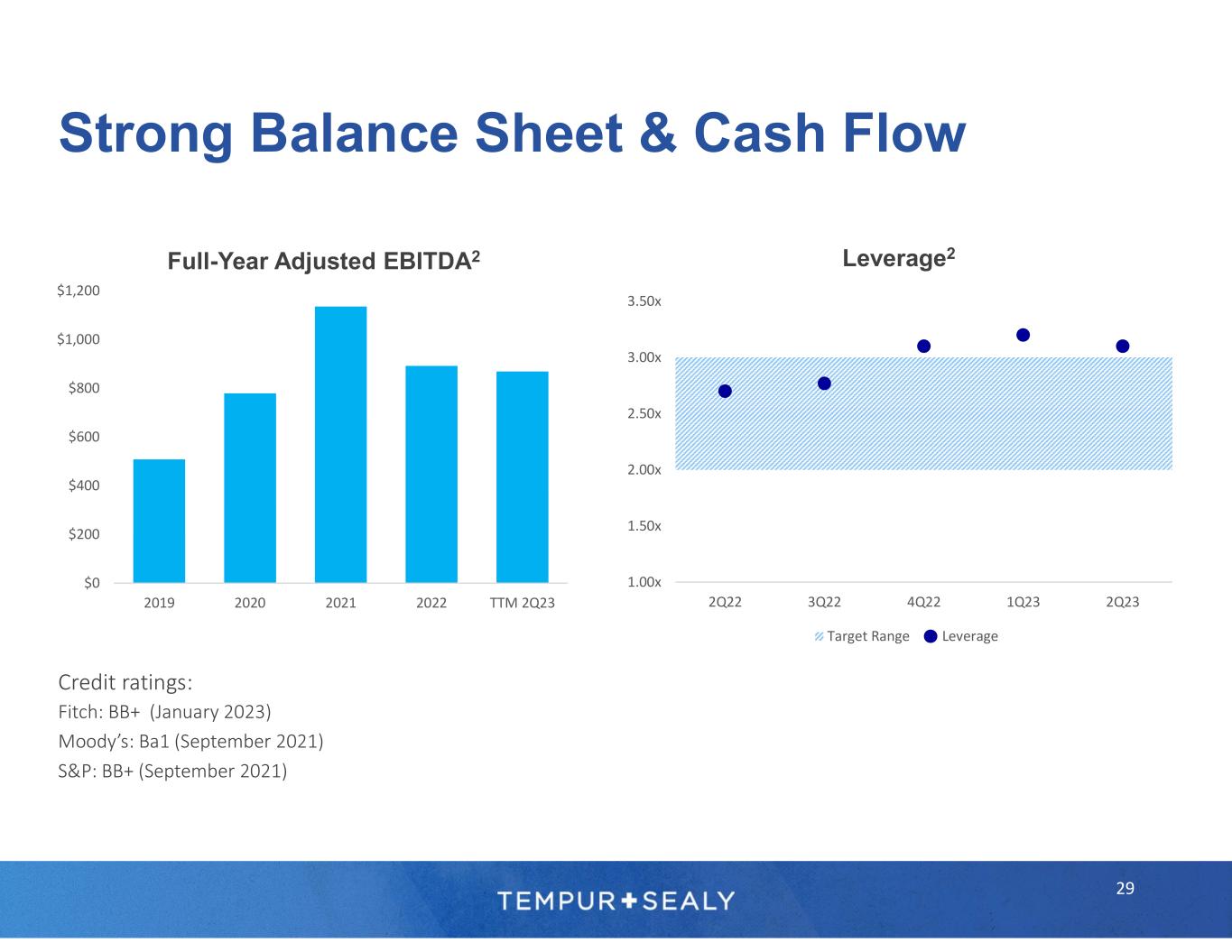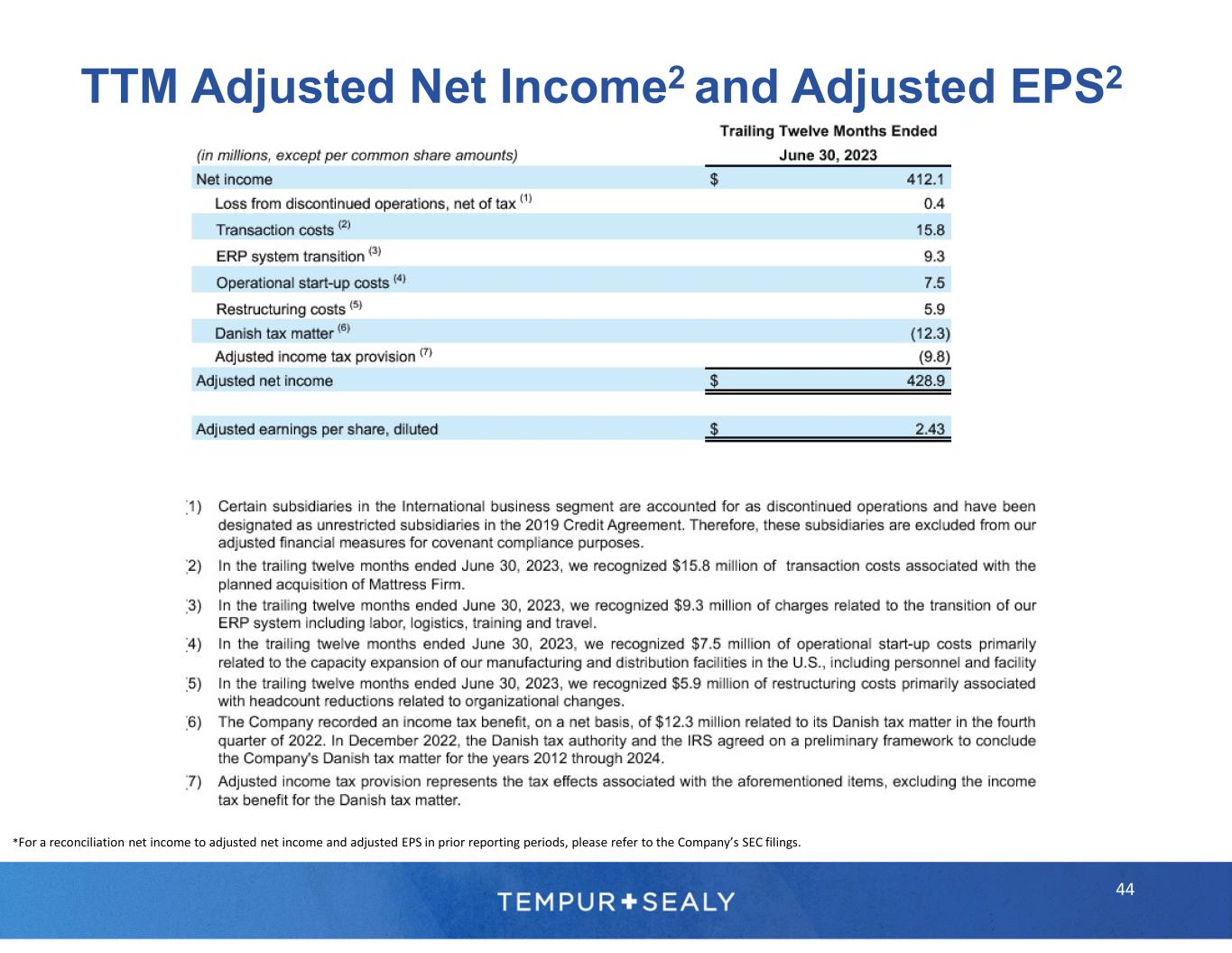 1 Management estimates 2 Adjusted net income, EBITDA, adjusted EBITDA, adjusted EPS, leverage, and free cash flow are non-GAAP financial measures. Please refer to the “Use of Non-GAAP Financial Measures Information” on a previous slide for more information regarding the definitions of adjusted net income, EBITDA, adjusted EBITDA, adjusted EPS, leverage, and free cash flow, including the adjustments (as applicable) from the corresponding GAAP information. Please refer to “Forward-Looking Statements” and “Limitations on Guidance” on a previous slide. 3 Sealy® was ranked number one on Furniture Today’s list of the Top 20 U.S. Bedding Producers in June 2021. See Furniture Today’s Top 20 U.S. Bedding Producers methodology that includes Sealy® and Stearns & Foster® products in Sealy ranking. Tempur-Pedic® was ranked number two on Furniture Today’s list of the Top 20 U.S. Bedding Producers in June 2021. Tempur-Pedic® brand was awarded #1 in Customer Satisfaction for both the Retail Mattress and Online Mattress categories in the U.S. in the J.D. Power 2022 Mattress Satisfaction Report. 4 Based on the Company’s 2023 financial targets provided in the press release dated August 3, 2023, and the related earnings call on August 3, 2023. Please refer to “Forward-Looking Statements” and “Limitations on Guidance.” The Company is unable to reconcile forward-looking adjusted EPS, a non-GAAP financial measure, to EPS, its most directly comparable forward-looking GAAP financial measure, without unreasonable efforts, because the Company is currently unable to predict with a reasonable degree of certainty the type and extent of certain items that would be expected to impact EPS in 2023. 5 Pro-forma ownership is based on shares outstanding at signing. Footnotes