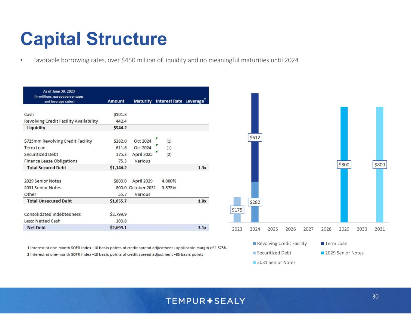 Credit ratings: Fitch: BB+ (January 2023) Moody’s: Ba1 (September 2021) S&P: BB+ (September 2021) Strong Balance Sheet & Cash Flow 29 $0 $200 $400 $600 $800 $1,000 $1,200 2019 2020 2021 2022 TTM 2Q23 Full-Year Adjusted EBITDA2 1.00x 1.50x 2.00x 2.50x 3.00x 3.50x 2Q22 3Q22 4Q22 1Q23 2Q23 Leverage2 Target Range Leverage