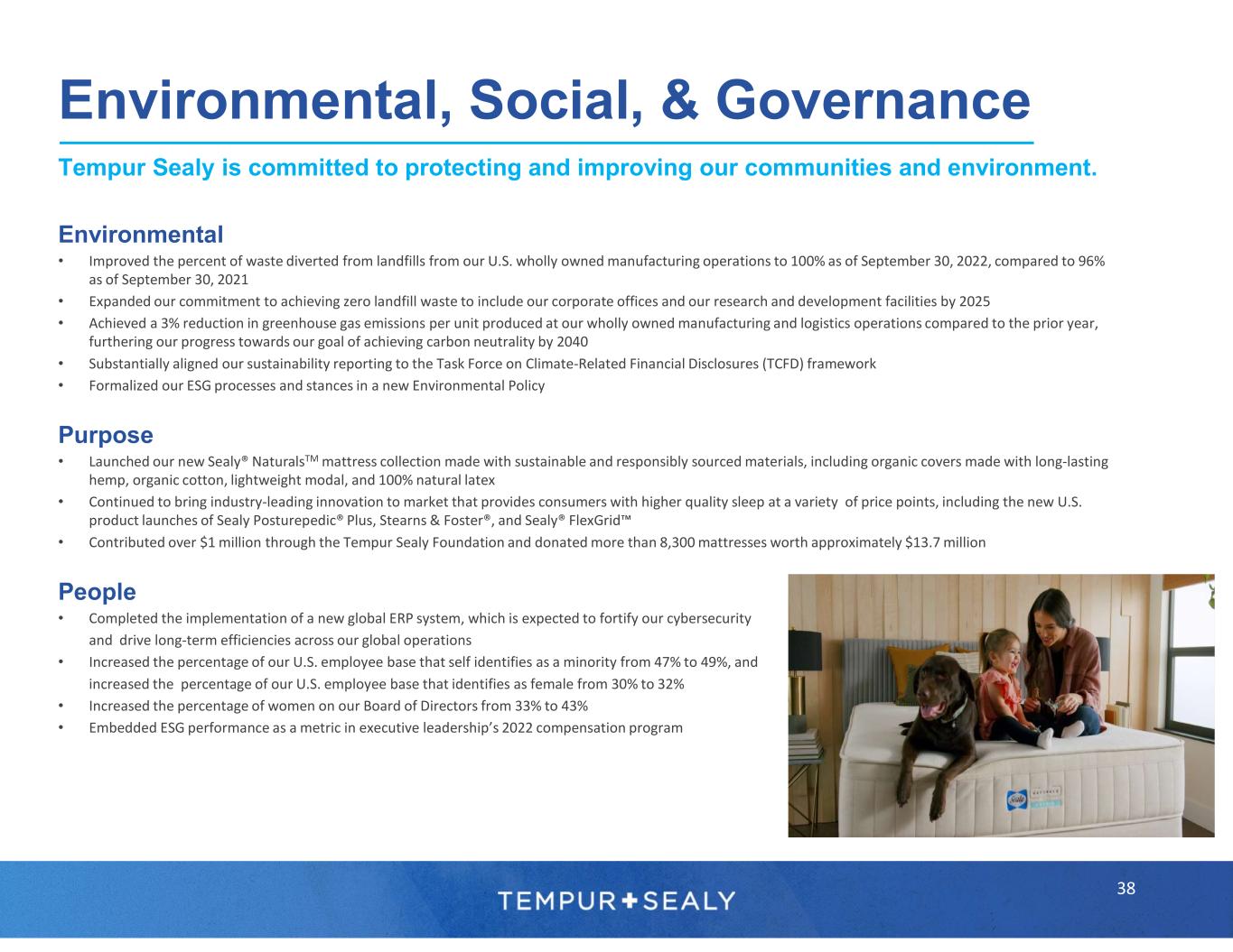 Environmental • Improved the percent of waste diverted from landfills from our U.S. wholly owned manufacturing operations to 100% as of September 30, 2022, compared to 96% as of September 30, 2021 • Expanded our commitment to achieving zero landfill waste to include our corporate offices and our research and development facilities by 2025 • Achieved a 3% reduction in greenhouse gas emissions per unit produced at our wholly owned manufacturing and logistics operations compared to the prior year, furthering our progress towards our goal of achieving carbon neutrality by 2040 • Substantially aligned our sustainability reporting to the Task Force on Climate-Related Financial Disclosures (TCFD) framework • Formalized our ESG processes and stances in a new Environmental Policy Purpose • Launched our new Sealy® NaturalsTM mattress collection made with sustainable and responsibly sourced materials, including organic covers made with long-lasting hemp, organic cotton, lightweight modal, and 100% natural latex • Continued to bring industry-leading innovation to market that provides consumers with higher quality sleep at a variety of price points, including the new U.S. product launches of Sealy Posturepedic® Plus, Stearns & Foster®, and Sealy® FlexGrid™ • Contributed over $1 million through the Tempur Sealy Foundation and donated more than 8,300 mattresses worth approximately $13.7 million People • Completed the implementation of a new global ERP system, which is expected to fortify our cybersecurity and drive long-term efficiencies across our global operations • Increased the percentage of our U.S. employee base that self identifies as a minority from 47% to 49%, and increased the percentage of our U.S. employee base that identifies as female from 30% to 32% • Increased the percentage of women on our Board of Directors from 33% to 43% • Embedded ESG performance as a metric in executive leadership’s 2022 compensation program Environmental, Social, & Governance Tempur Sealy is committed to protecting and improving our communities and environment. 38