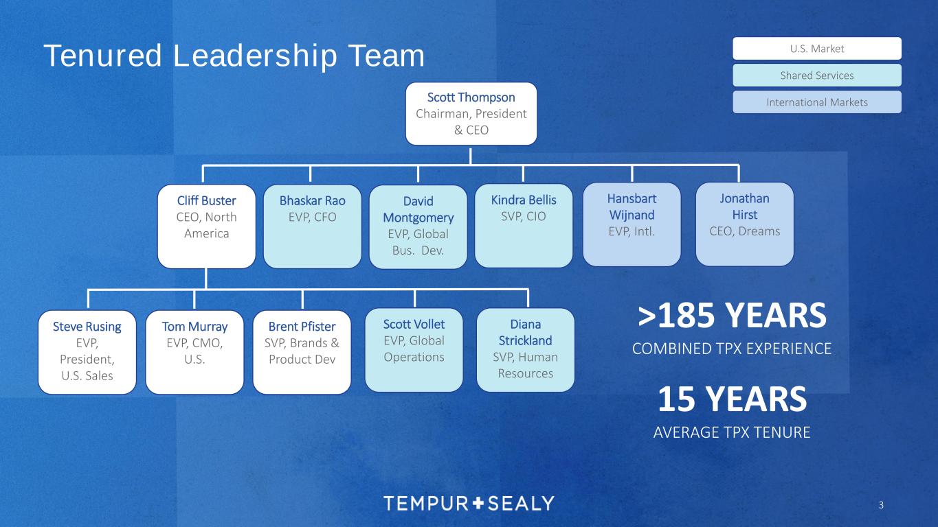 2 History of market share gains across global omnichannel distribution Seasoned, well-aligned management with proven track record Legacy of strong value creation via capital allocation including share buybacks and acquisitions The leading vertically integrated global bedding company with iconic brands and extensive manufacturing capabilities Over the long term, the bedding industry has consistently grown through ASP and unit expansion Investment Thesis