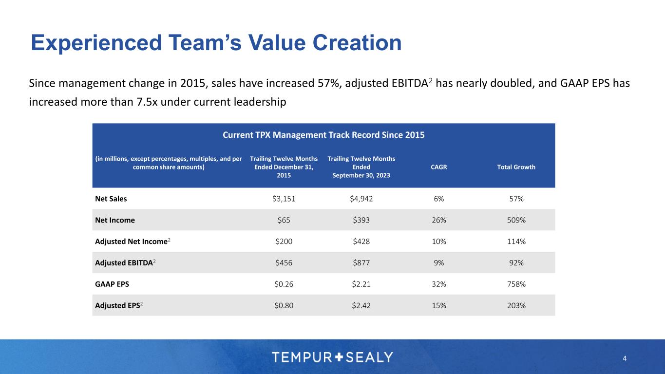 3 U.S. Market International Markets Tenured Leadership Team >185 YEARS COMBINED TPX EXPERIENCE 15 YEARS AVERAGE TPX TENURE Shared Services Scott Thompson Chairman, President & CEO Bhaskar Rao EVP, CFO Cliff Buster CEO, North America Diana Strickland SVP, Human Resources Kindra Bellis SVP, CIO David Montgomery EVP, Global Bus. Dev. Scott Vollet EVP, Global Operations Jonathan Hirst CEO, Dreams Hansbart Wijnand EVP, Intl. Steve Rusing EVP, President, U.S. Sales Brent Pfister SVP, Brands & Product Dev Tom Murray EVP, CMO, U.S.