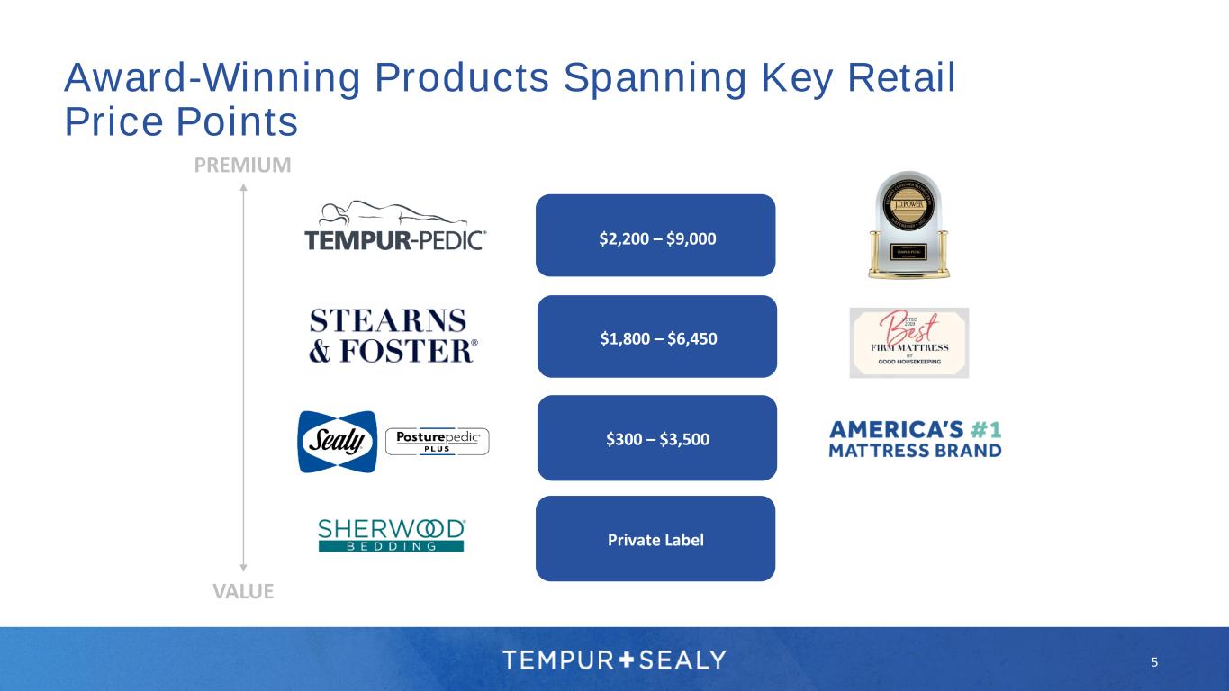 4 Experienced Team’s Value Creation Since management change in 2015, sales have increased 57%, adjusted EBITDA2 has nearly doubled, and GAAP EPS has increased more than 7.5x under current leadership Current TPX Management Track Record Since 2015 (in millions, except percentages, multiples, and per common share amounts) Trailing Twelve Months Ended December 31, 2015 Trailing Twelve Months Ended September 30, 2023 CAGR Total Growth Net Sales $3,151 $4,942 6% 57% Net Income $65 $393 26% 509% Adjusted Net Income2 $200 $428 10% 114% Adjusted EBITDA2 $456 $877 9% 92% GAAP EPS $0.26 $2.21 32% 758% Adjusted EPS2 $0.80 $2.42 15% 203%