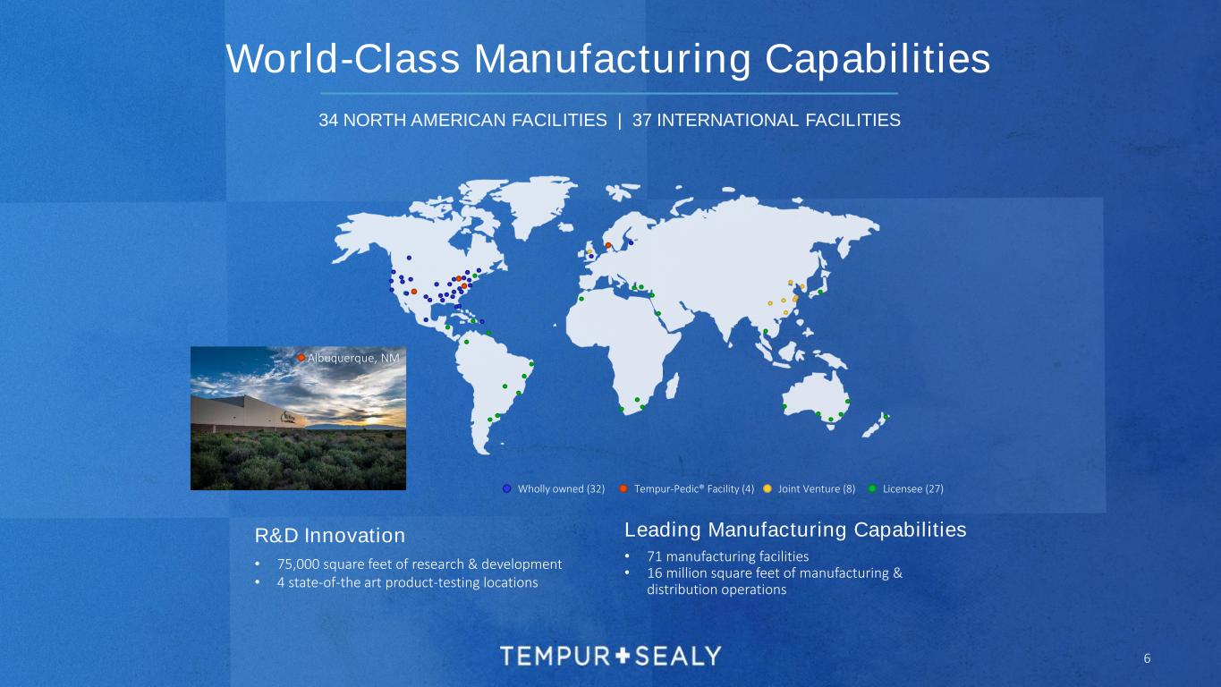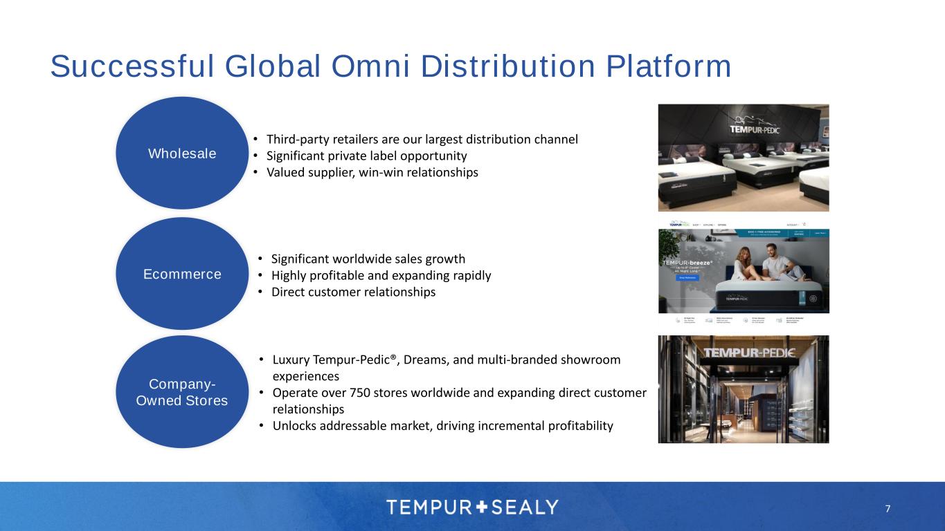 Leading Manufacturing Capabilities • 71 manufacturing facilities • 16 million square feet of manufacturing & distribution operations R&D Innovation • 75,000 square feet of research & development • 4 state-of-the art product-testing locations Wholly owned (32) Joint Venture (8) Licensee (27)Tempur-Pedic® Facility (4) World-Class Manufacturing Capabilities 34 NORTH AMERICAN FACILITIES | 37 INTERNATIONAL FACILITIES Albuquerque, NM 6