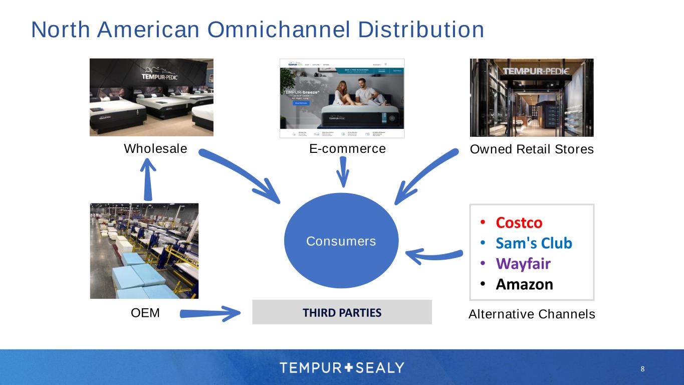 • Significant worldwide sales growth • Highly profitable and expanding rapidly • Direct customer relationships Ecommerce • Luxury Tempur-Pedic®, Dreams, and multi-branded showroom experiences • Operate over 750 stores worldwide and expanding direct customer relationships • Unlocks addressable market, driving incremental profitability Company- Owned Stores • Third-party retailers are our largest distribution channel • Significant private label opportunity • Valued supplier, win-win relationships Wholesale 7 Successful Global Omni Distribution Platform