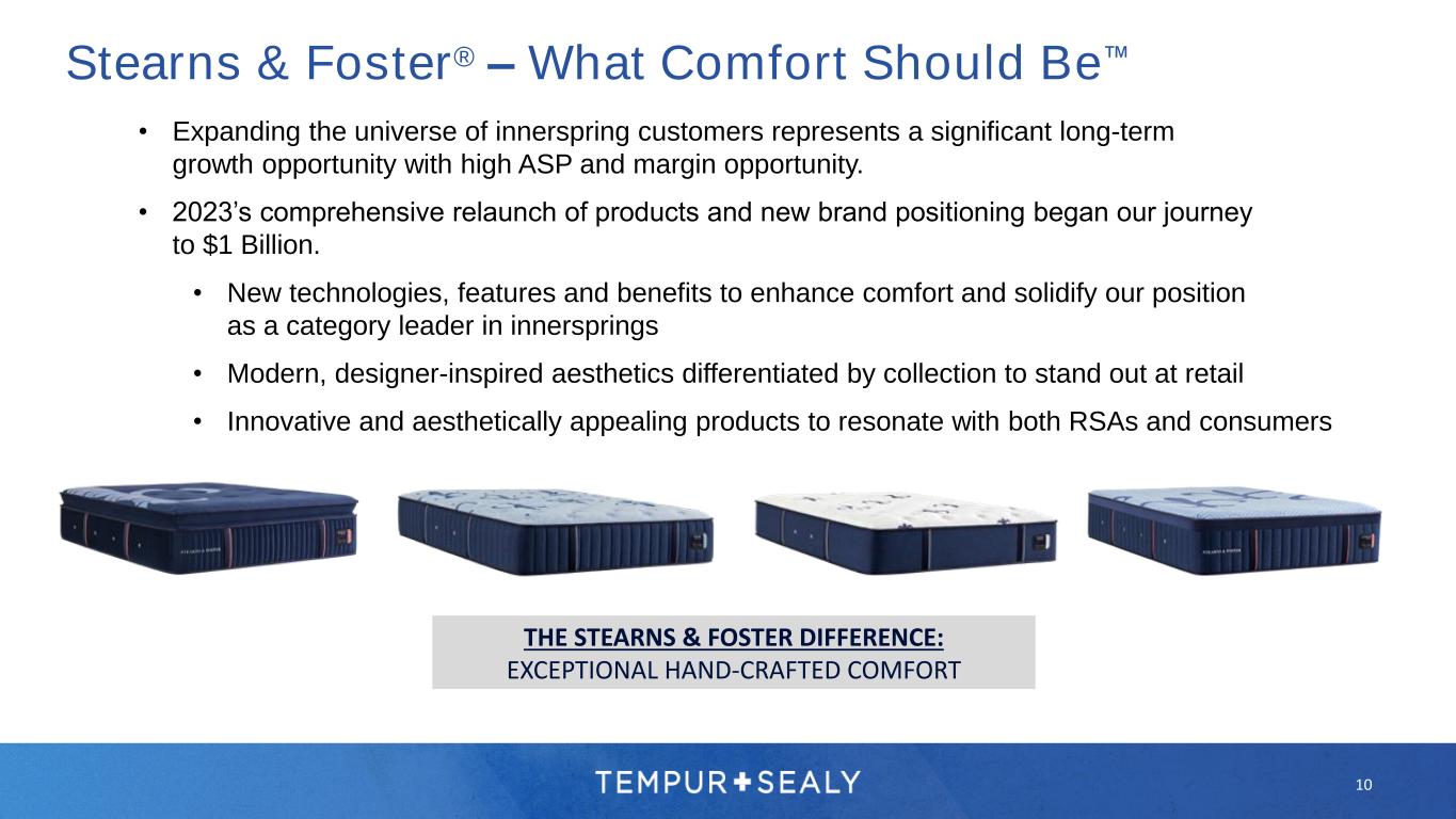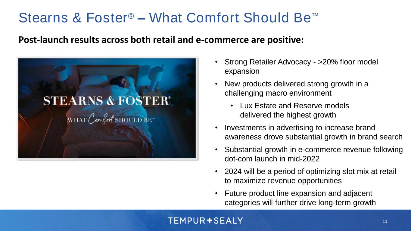 WHAT COMFORT SHOULD BE™ STEARNS & FOSTER® • Expanding the universe of innerspring customers represents a significant long-term growth opportunity with high ASP and margin opportunity. • 2023’s comprehensive relaunch of products and new brand positioning began our journey to $1 Billion. • New technologies, features and benefits to enhance comfort and solidify our position as a category leader in innersprings • Modern, designer-inspired aesthetics differentiated by collection to stand out at retail • Innovative and aesthetically appealing products to resonate with both RSAs and consumers THE STEARNS & FOSTER DIFFERENCE: EXCEPTIONAL HAND-CRAFTED COMFORT Stearns & Foster® – What Comfort Should Be™ 10