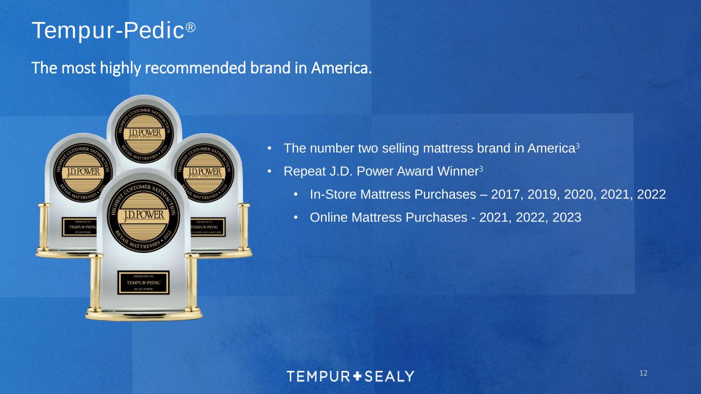 WHAT COMFORT SHOULD BE™ STEARNS & FOSTER® • Strong Retailer Advocacy - >20% floor model expansion • New products delivered strong growth in a challenging macro environment • Lux Estate and Reserve models delivered the highest growth • Investments in advertising to increase brand awareness drove substantial growth in brand search • Substantial growth in e-commerce revenue following dot-com launch in mid-2022 • 2024 will be a period of optimizing slot mix at retail to maximize revenue opportunities • Future product line expansion and adjacent categories will further drive long-term growth Post-launch results across both retail and e-commerce are positive: Stearns & Foster® – What Comfort Should Be™ 11