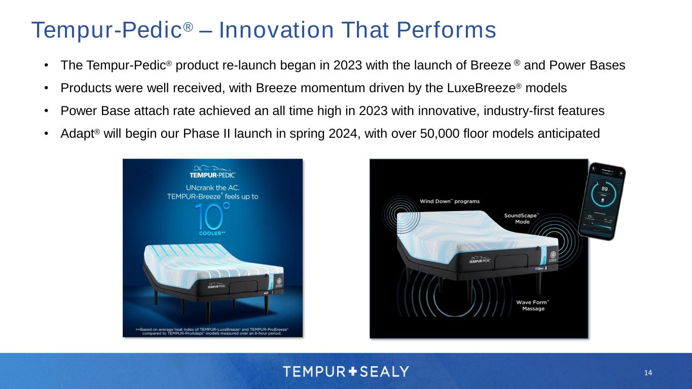• Continued focus on innovating around core consumer needs to drive success. • Building on over 30 years of innovation, the Tempur line focuses on three key needs: Tempur-Pedic® – Deep, Undisturbed Sleep® 13 4