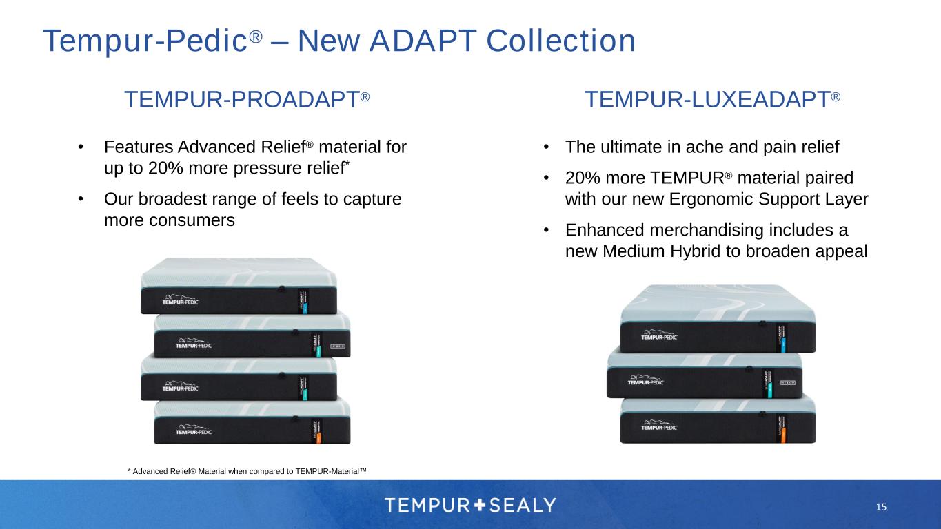• The Tempur-Pedic® product re-launch began in 2023 with the launch of Breeze ® and Power Bases • Products were well received, with Breeze momentum driven by the LuxeBreeze® models • Power Base attach rate achieved an all time high in 2023 with innovative, industry-first features • Adapt® will begin our Phase II launch in spring 2024, with over 50,000 floor models anticipated Tempur-Pedic® – Innovation That Performs 14