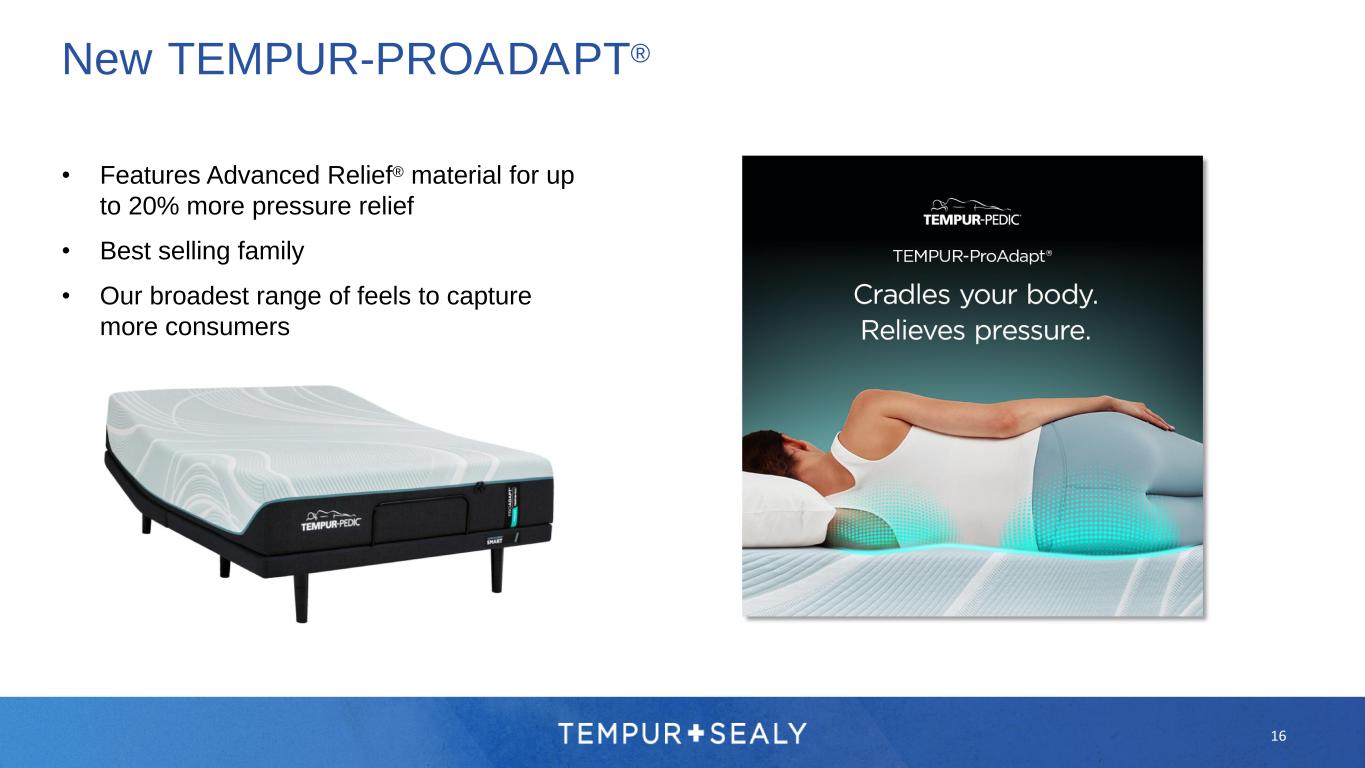 Tempur-Pedic® – New ADAPT Collection • The ultimate in ache and pain relief • 20% more TEMPUR® material paired with our new Ergonomic Support Layer • Enhanced merchandising includes a new Medium Hybrid to broaden appeal TEMPUR-LUXEADAPT® • Features Advanced Relief® material for up to 20% more pressure relief* • Our broadest range of feels to capture more consumers TEMPUR-PROADAPT® * Advanced Relief® Material when compared to TEMPUR-Material™ 15