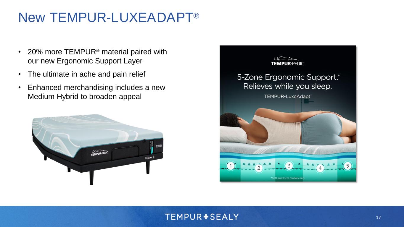 New TEMPUR-PROADAPT® • Features Advanced Relief® material for up to 20% more pressure relief • Best selling family • Our broadest range of feels to capture more consumers 16