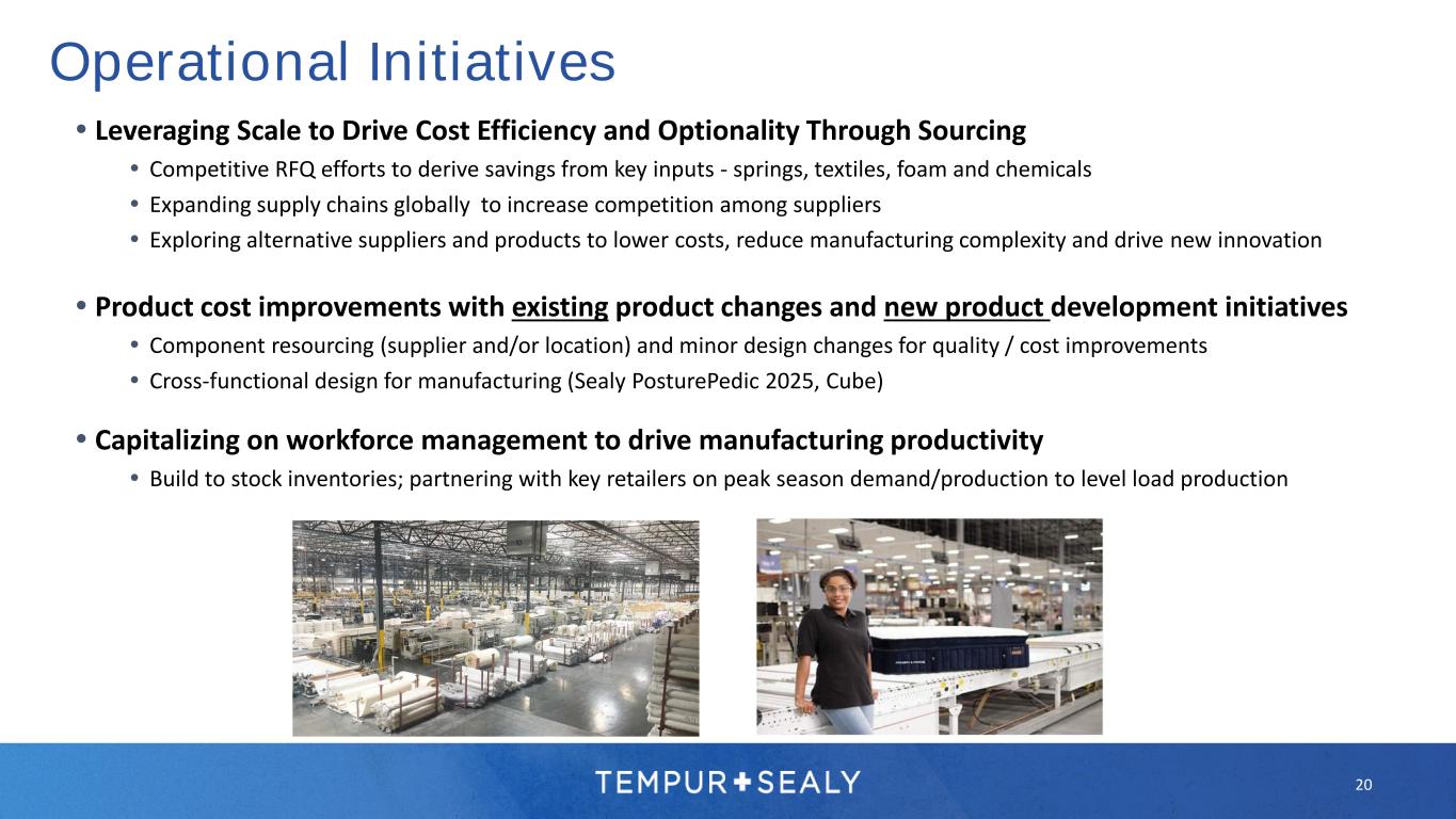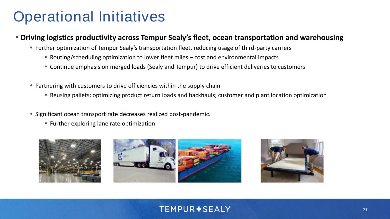 Operational Initiatives  Leveraging Scale to Drive Cost Efficiency and Optionality Through Sourcing  Competitive RFQ efforts to derive savings from key inputs - springs, textiles, foam and chemicals  Expanding supply chains globally to increase competition among suppliers  Exploring alternative suppliers and products to lower costs, reduce manufacturing complexity and drive new innovation  Product cost improvements with existing product changes and new product development initiatives  Component resourcing (supplier and/or location) and minor design changes for quality / cost improvements  Cross-functional design for manufacturing (Sealy PosturePedic 2025, Cube)  Capitalizing on workforce management to drive manufacturing productivity  Build to stock inventories; partnering with key retailers on peak season demand/production to level load production 20