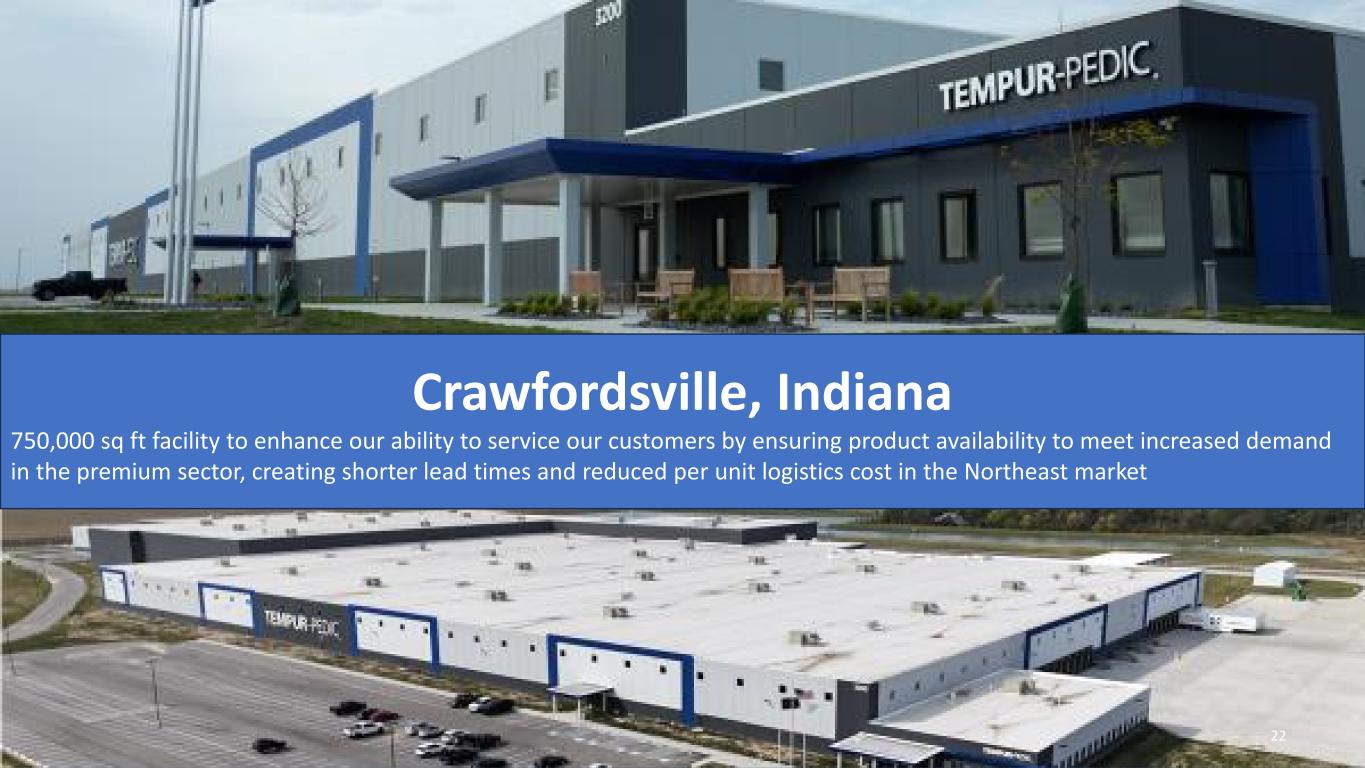 Operational Initiatives  Driving logistics productivity across Tempur Sealy’s fleet, ocean transportation and warehousing  Further optimization of Tempur Sealy’s transportation fleet, reducing usage of third-party carriers  Routing/scheduling optimization to lower fleet miles – cost and environmental impacts  Continue emphasis on merged loads (Sealy and Tempur) to drive efficient deliveries to customers  Partnering with customers to drive efficiencies within the supply chain  Reusing pallets; optimizing product return loads and backhauls; customer and plant location optimization  Significant ocean transport rate decreases realized post-pandemic.  Further exploring lane rate optimization 21