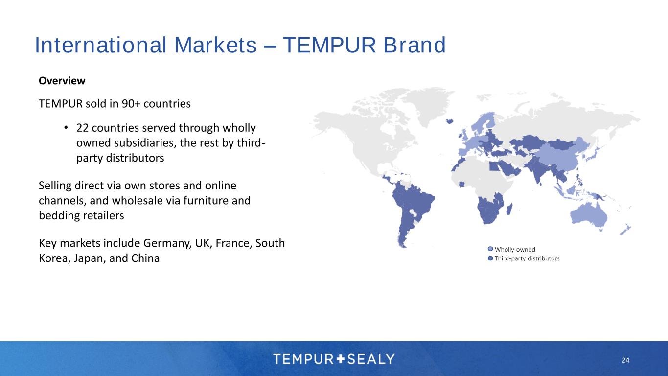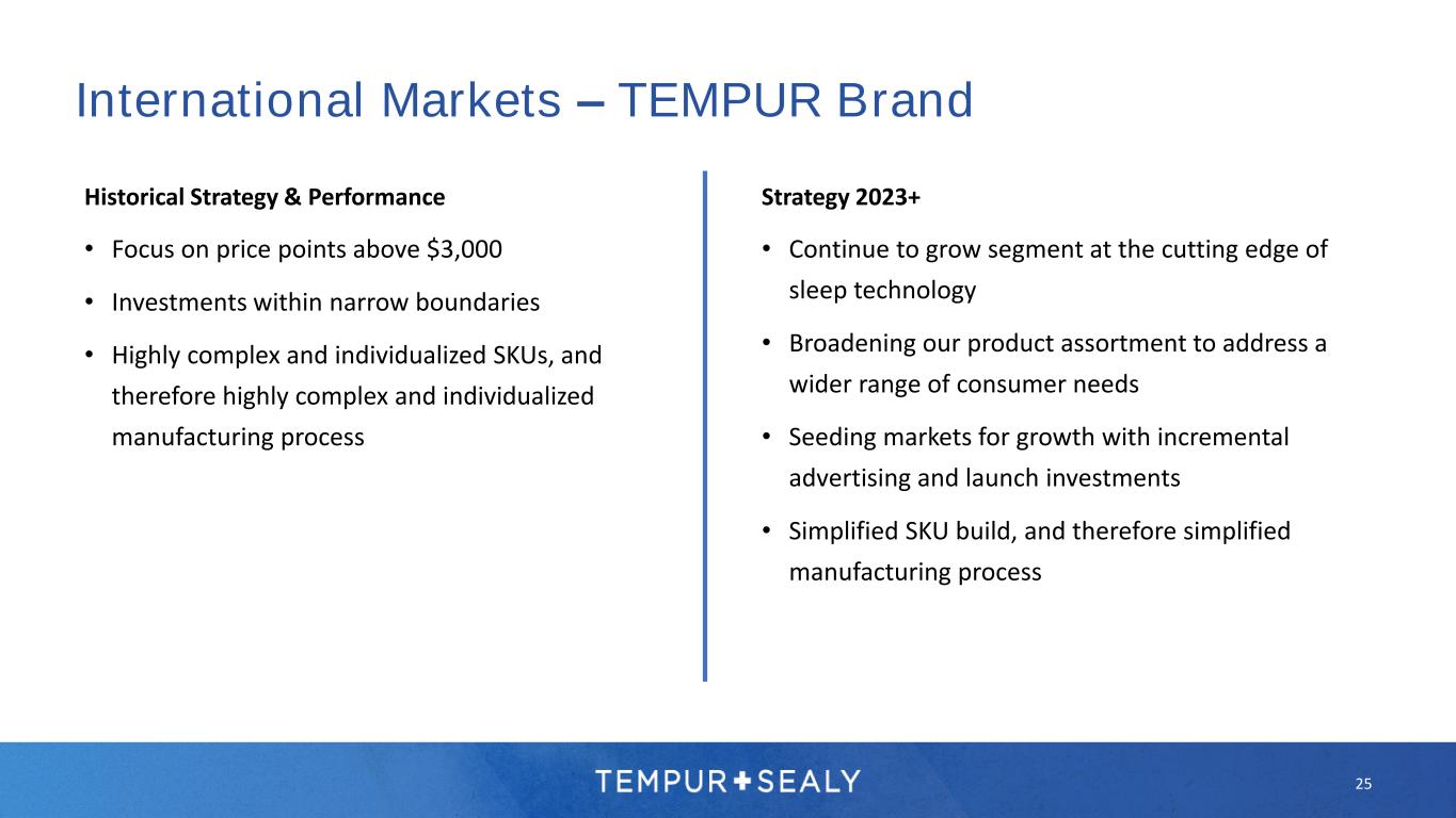 24 International Markets – TEMPUR Brand Overview TEMPUR sold in 90+ countries • 22 countries served through wholly owned subsidiaries, the rest by third- party distributors Selling direct via own stores and online channels, and wholesale via furniture and bedding retailers Key markets include Germany, UK, France, South Korea, Japan, and China Wholly-owned Third-party distributors