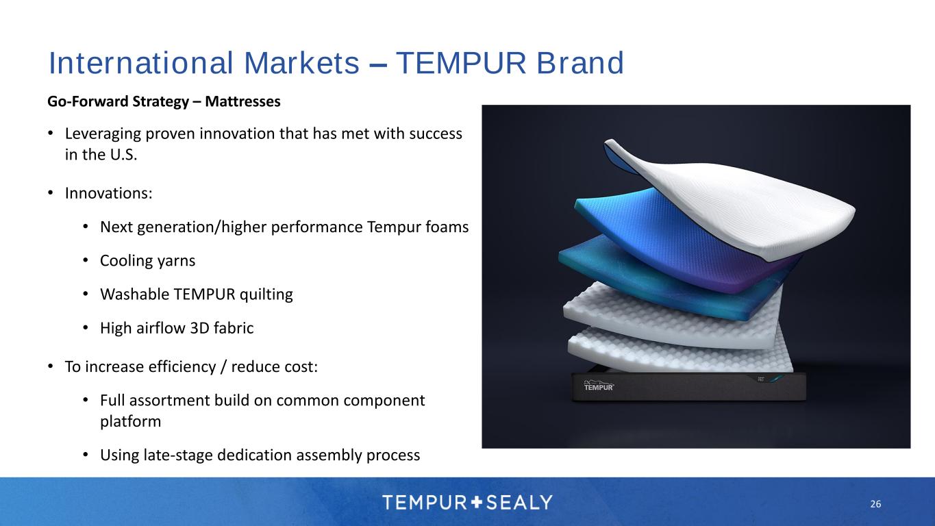 25 International Markets – TEMPUR Brand Historical Strategy & Performance • Focus on price points above $3,000 • Investments within narrow boundaries • Highly complex and individualized SKUs, and therefore highly complex and individualized manufacturing process Strategy 2023+ • Continue to grow segment at the cutting edge of sleep technology • Broadening our product assortment to address a wider range of consumer needs • Seeding markets for growth with incremental advertising and launch investments • Simplified SKU build, and therefore simplified manufacturing process