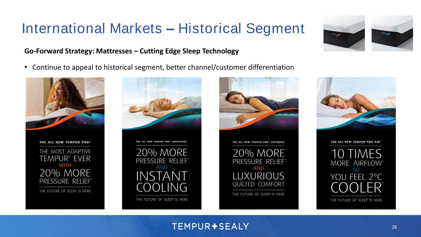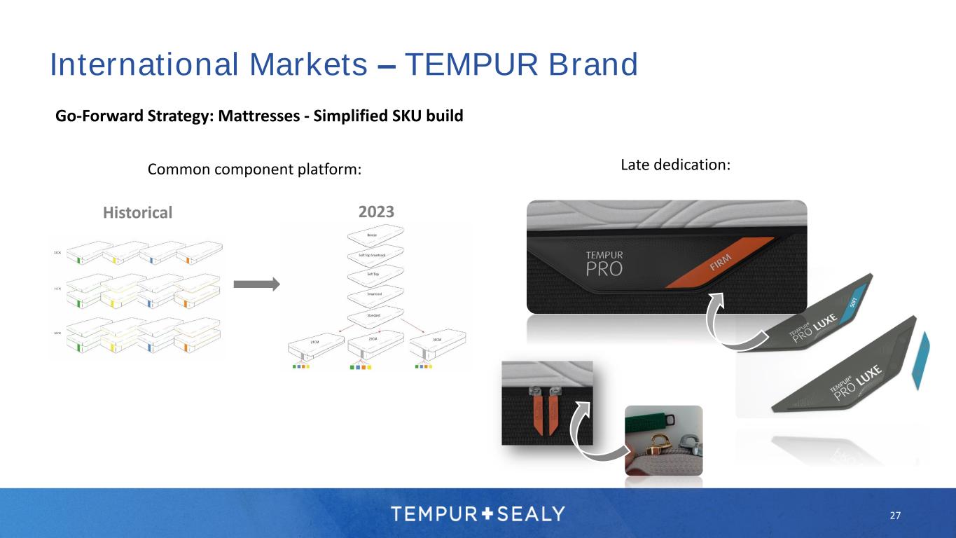 27 International Markets – TEMPUR Brand Go-Forward Strategy: Mattresses - Simplified SKU build Historical 2023 Common component platform: Late dedication:
