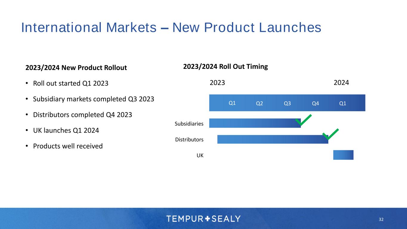 31 International Markets – New Bed Bases Go-Forward Strategy • Continue to grow sales of most advanced bases while broadening product offering TEMPUR ONE™/EASE™ TEMPUR ARC™