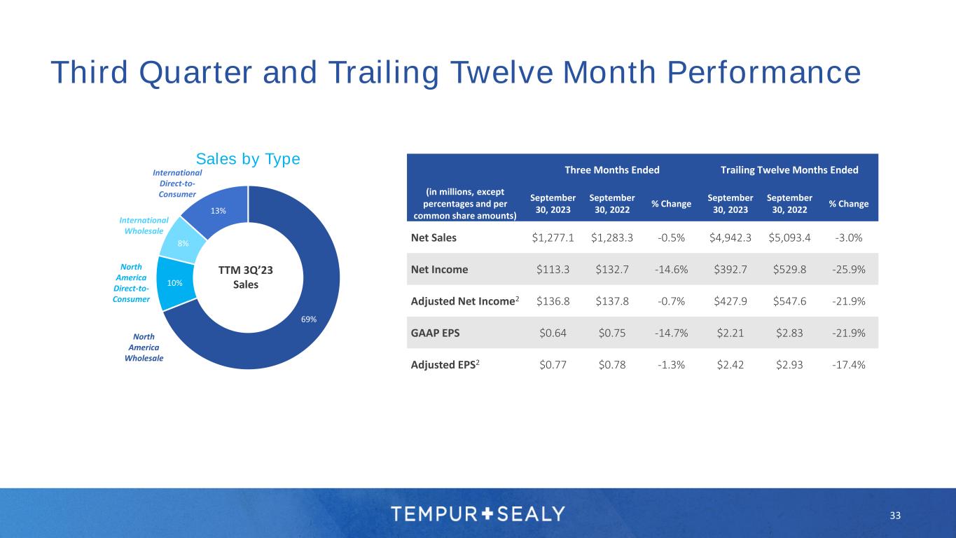 Third Quarter and Trailing Twelve Month Performance Sales by Type 33 69% 10% 8% 13% TTM 3Q’23 Sales North America Wholesale North America Direct-to- Consumer International Wholesale International Direct-to- Consumer Three Months Ended Trailing Twelve Months Ended (in millions, except percentages and per common share amounts) September 30, 2023 September 30, 2022 % Change September 30, 2023 September 30, 2022 % Change Net Sales $1,277.1 $1,283.3 -0.5% $4,942.3 $5,093.4 -3.0% Net Income $113.3 $132.7 -14.6% $392.7 $529.8 -25.9% Adjusted Net Income2 $136.8 $137.8 -0.7% $427.9 $547.6 -21.9% GAAP EPS $0.64 $0.75 -14.7% $2.21 $2.83 -21.9% Adjusted EPS2 $0.77 $0.78 -1.3% $2.42 $2.93 -17.4%