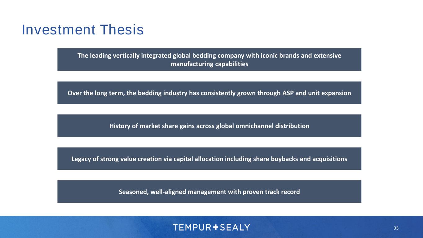 35 History of market share gains across global omnichannel distribution Seasoned, well-aligned management with proven track record Legacy of strong value creation via capital allocation including share buybacks and acquisitions The leading vertically integrated global bedding company with iconic brands and extensive manufacturing capabilities Over the long term, the bedding industry has consistently grown through ASP and unit expansion Investment Thesis