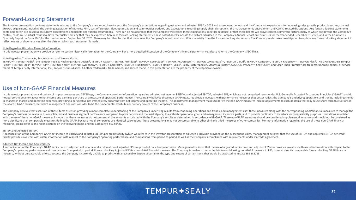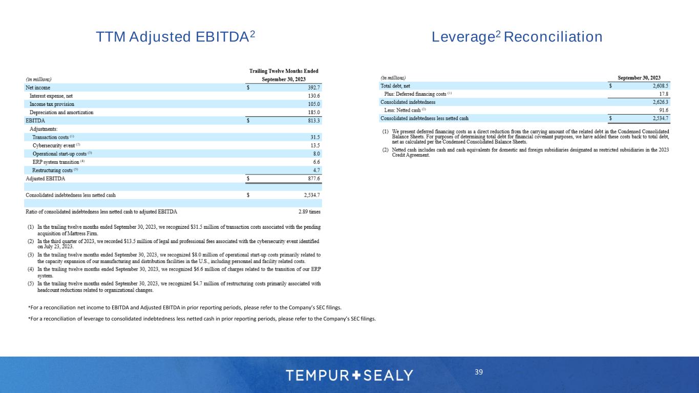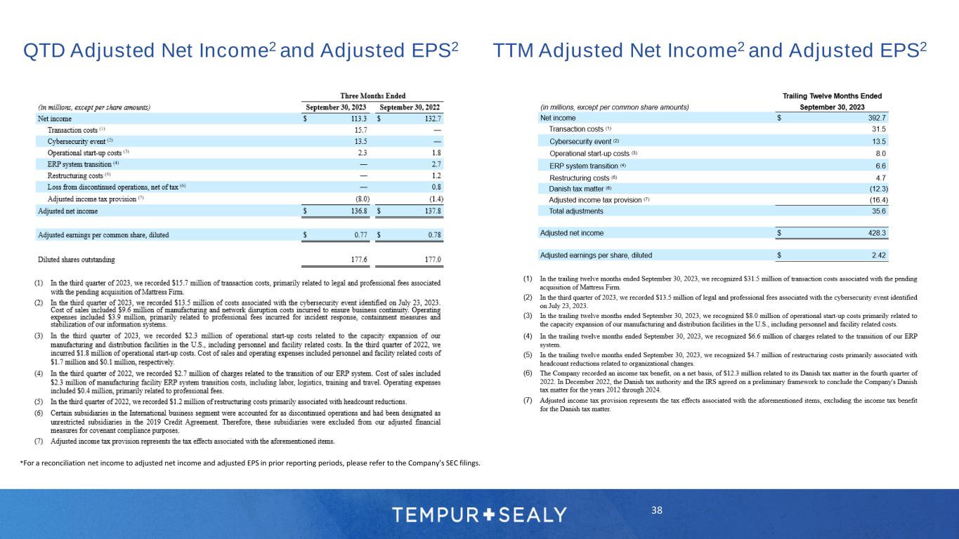 37 Forward-Looking Statements Use of Non-GAAP Financial Measures In this investor presentation and certain of its press releases and SEC filings, the Company provides information regarding adjusted net income, EBITDA, and adjusted EBITDA, adjusted EPS, which are not recognized terms under U.S. Generally Accepted Accounting Principles (“GAAP”) and do not purport to be alternatives to net income and earnings per share as a measure of operating performance. The Company believes these non-GAAP measures provide investors with performance measures that better reflect the Company’s underlying operations and trends, including trends in changes in margin and operating expenses, providing a perspective not immediately apparent from net income and operating income. The adjustments management makes to derive the non-GAAP measures include adjustments to exclude items that may cause short-term fluctuations in the nearest GAAP measure, but which management does not consider to be the fundamental attributes or primary drivers of the Company’s business. The Company believes that exclusion of these items assists in providing a more complete understanding of the Company’s underlying results from continuing operations and trends, and management uses these measures along with the corresponding GAAP financial measures to manage the Company’s business, to evaluate its consolidated and business segment performance compared to prior periods and the marketplace, to establish operational goals and management incentive goals, and to provide continuity to investors for comparability purposes. Limitations associated with the use of these non-GAAP measures include that these measures do not present all the amounts associated with the Company’s results as determined in accordance with GAAP. These non-GAAP measures should be considered supplemental in nature and should not be construed as more significant than comparable measures defined by GAAP. Because not all companies use identical calculations, these presentations may not be comparable to other similarly titled measures of other companies. For more information regarding the use of these non-GAAP financial measures, please refer to the reconciliations on the following pages and the Company’s SEC filings. EBITDA and Adjusted EBITDA A reconciliation of the Company’s GAAP net income to EBITDA and adjusted EBITDA per credit facility (which we refer to in this investor presentation as adjusted EBITDA) is provided on the subsequent slides. Management believes that the use of EBITDA and adjusted EBITDA per credit facility provides investors with useful information with respect to the Company’s operating performance and comparisons from period to period as well as the Company’s compliance with requirements under its credit agreement. Adjusted Net Income and Adjusted EPS A reconciliation of the Company’s GAAP net income to adjusted net income and a calculation of adjusted EPS are provided on subsequent slides. Management believes that the use of adjusted net income and adjusted EPS also provides investors with useful information with respect to the Company’s operating performance and comparisons from period to period. Forward-looking Adjusted EPS is a non-GAAP financial measure. The Company is unable to reconcile this forward-looking non-GAAP measure to EPS, its most directly comparable forward-looking GAAP financial measure, without unreasonable efforts, because the Company is currently unable to predict with a reasonable degree of certainty the type and extent of certain items that would be expected to impact EPS in 2023. This investor presentation contains statements relating to the Company’s share repurchase targets, the Company’s expectations regarding net sales and adjusted EPS for 2023 and subsequent periods and the Company’s expectations for increasing sales growth, product launches, channel growth, acquisitions, including the pending acquisition of Mattress Firm, cost efficiencies, fleet optimization and commodities outlook, and expectations regarding supply chain disruptions, the macroeconomic environment and COVID-related disruptions. Any forward-looking statements contained herein are based upon current expectations and beliefs and various assumptions. There can be no assurance that the Company will realize these expectations, meet its guidance, or that these beliefs will prove correct. Numerous factors, many of which are beyond the Company’s control, could cause actual results to differ materially from any that may be expressed herein as forward-looking statements. These potential risks include the factors discussed in the Company’s Annual Report on Form 10-K for the year ended December 31, 2022, and in the Company’s Quarterly Report on Form 10-Q for the quarter ended September 30, 2023. There may be other factors that may cause the Company’s actual results to differ materially from the forward-looking statements. The Company undertakes no obligation to update any forward-looking statement to reflect events or circumstances after the date on which such statement is made. Note Regarding Historical Financial Information: In this investor presentation we provide or refer to certain historical information for the Company. For a more detailed discussion of the Company’s financial performance, please refer to the Company’s SEC filings. Note Regarding Trademarks, Trade Names, and Service Marks: TEMPUR®, Tempur-Pedic®, the Tempur-Pedic & Reclining Figure Design®, TEMPUR-Adapt®, TEMPUR-ProAdapt®, TEMPUR-LuxeAdapt®, TEMPUR-PRObreeze°™, TEMPUR-LUXEbreeze°™, TEMPUR-Cloud®, TEMPUR-Contour™, TEMPUR-Rhapsody™, TEMPUR-Flex®, THE GRANDBED BY Tempur- Pedic®, TEMPUR-Ergo®, TEMPUR-UP™, TEMPUR-Neck™, TEMPUR-Symphony™, TEMPUR-Comfort™, TEMPUR-Traditional™, TEMPUR-Home™, Sealy®, Sealy Posturepedic®, Stearns & Foster®, COCOON by Sealy™, SealyChill™, and Clean Shop Promise® are trademarks, trade names, o