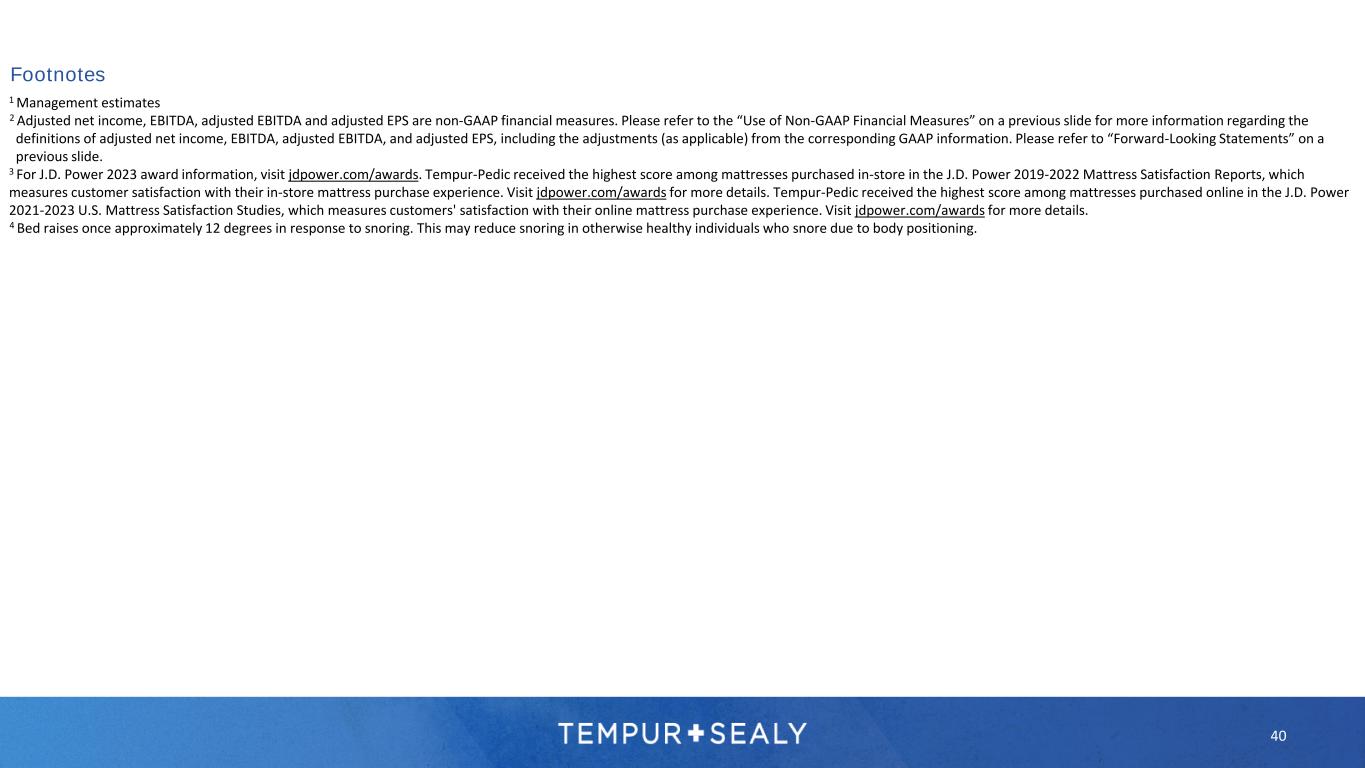 40 1 Management estimates 2 Adjusted net income, EBITDA, adjusted EBITDA and adjusted EPS are non-GAAP financial measures. Please refer to the “Use of Non-GAAP Financial Measures” on a previous slide for more information regarding the definitions of adjusted net income, EBITDA, adjusted EBITDA, and adjusted EPS, including the adjustments (as applicable) from the corresponding GAAP information. Please refer to “Forward-Looking Statements” on a previous slide. 3 For J.D. Power 2023 award information, visit jdpower.com/awards. Tempur-Pedic received the highest score among mattresses purchased in-store in the J.D. Power 2019-2022 Mattress Satisfaction Reports, which measures customer satisfaction with their in-store mattress purchase experience. Visit jdpower.com/awards for more details. Tempur-Pedic received the highest score among mattresses purchased online in the J.D. Power 2021-2023 U.S. Mattress Satisfaction Studies, which measures customers' satisfaction with their online mattress purchase experience. Visit jdpower.com/awards for more details. 4 Bed raises once approximately 12 degrees in response to snoring. This may reduce snoring in otherwise healthy individuals who snore due to body positioning. Footnotes