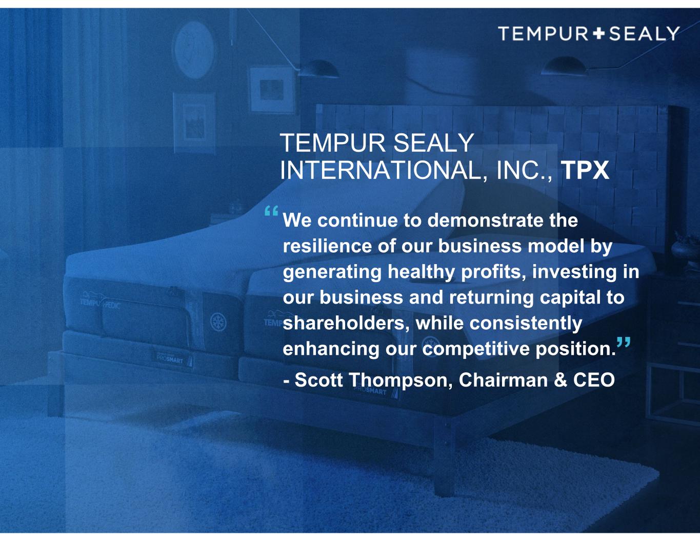 We continue to demonstrate the resilience of our business model by generating healthy profits, investing in our business and returning capital to shareholders, while consistently enhancing our competitive position. - Scott Thompson, Chairman & CEO TEMPUR SEALY INTERNATIONAL, INC., TPX “ “