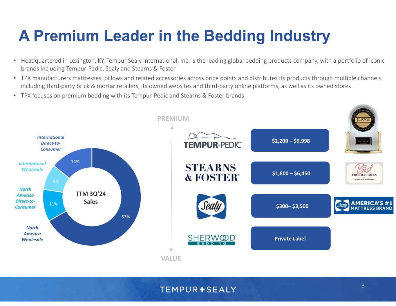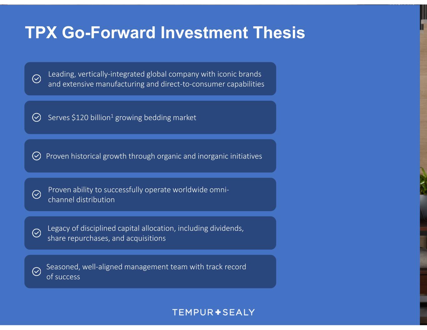 TPX Go-Forward Investment Thesis Leading, vertically‐integrated global company with iconic brands  and extensive manufacturing and direct‐to‐consumer capabilities Proven historical growth through organic and inorganic initiatives Proven ability to successfully operate worldwide omni‐ channel distribution Legacy of disciplined capital allocation, including dividends,  share repurchases, and acquisitions Seasoned, well‐aligned management team with track record  of success Serves $120 billion1 growing bedding market