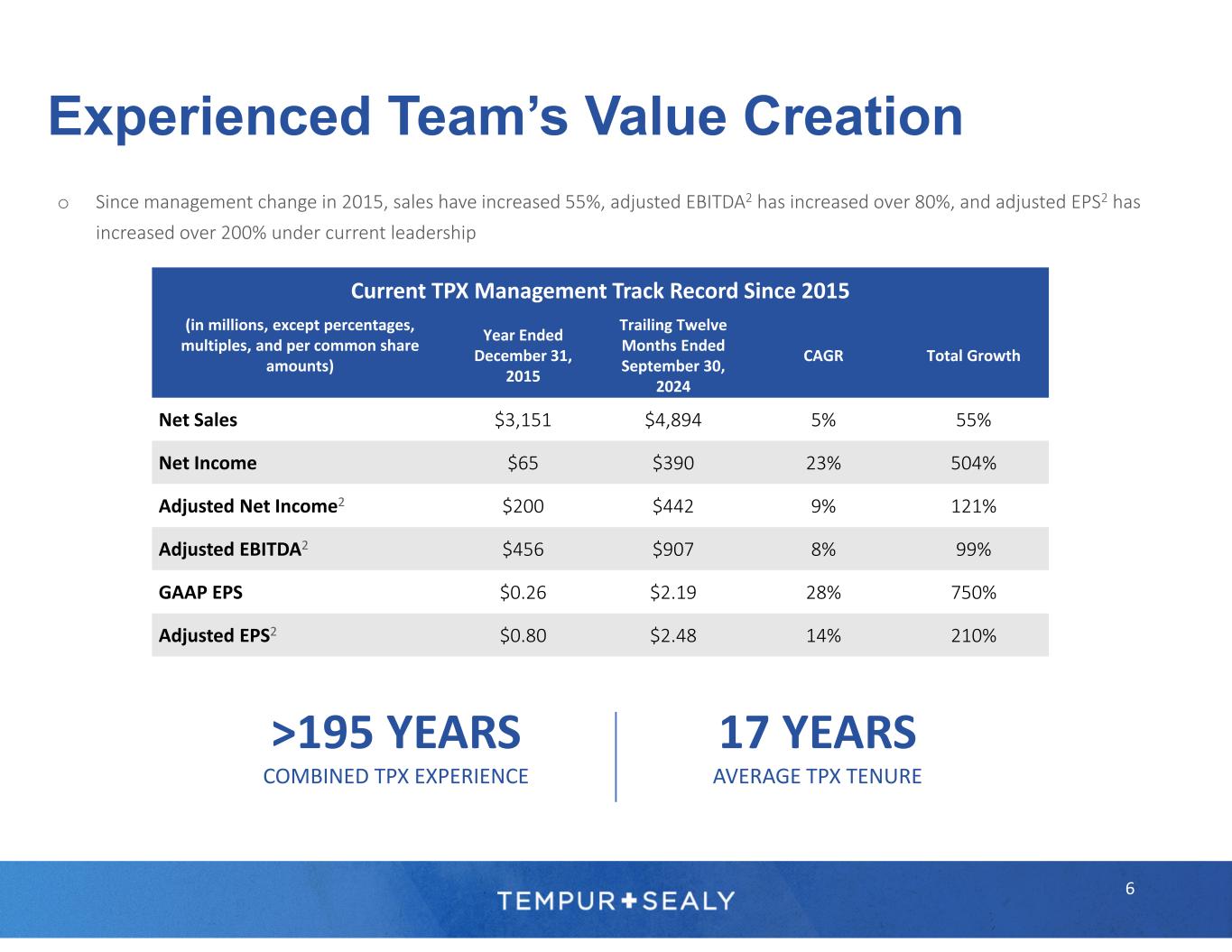 Investment Thesis 5 The leading vertically integrated global bedding company with iconic brands and extensive  manufacturing capabilities History of market share gains across global omnichannel distribution Seasoned, well‐aligned management with proven track record Legacy of strong value creation via capital allocation including share buybacks and acquisitions Over the long term, the bedding industry has consistently grown through ASP and  unit expansion