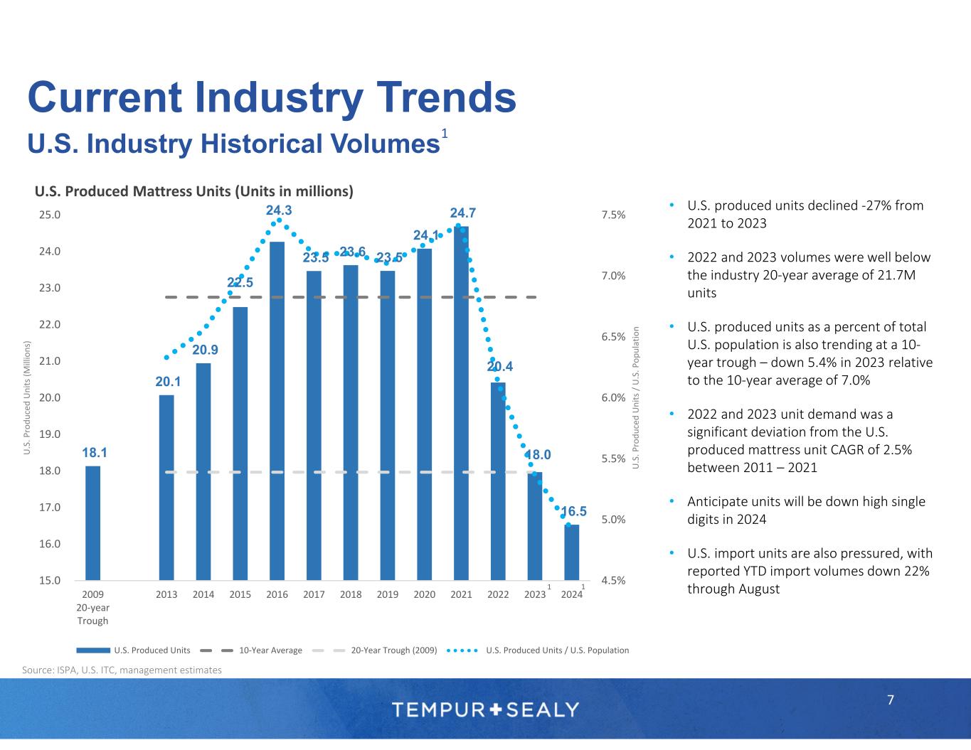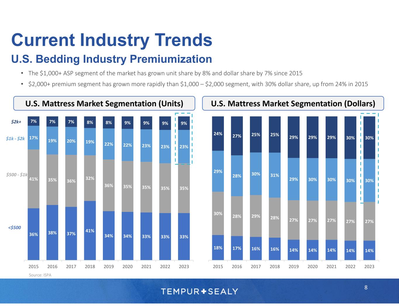 • U.S. produced units declined ‐27% from  2021 to 2023 • 2022 and 2023 volumes were well below  the industry 20‐year average of 21.7M  units • U.S. produced units as a percent of total  U.S. population is also trending at a 10‐ year trough – down 5.4% in 2023 relative  to the 10‐year average of 7.0% • 2022 and 2023 unit demand was a  significant deviation from the U.S.  produced mattress unit CAGR of 2.5%  between 2011 – 2021 • Anticipate units will be down high single  digits in 2024 • U.S. import units are also pressured, with  reported YTD import volumes down 22%  through August U.S. Produced Mattress Units (Units in millions) Current Industry Trends U.S. Industry Historical Volumes1 7 Source: ISPA, U.S. ITC, management estimates 1 18.1 20.1 20.9 22.5 24.3 23.5 23.6 23.5 24.1 24.7 20.4 18.0 16.5 4.5% 5.0% 5.5% 6.0% 6.5% 7.0% 7.5%  15.0  16.0  17.0  18.0  19.0  20.0  21.0  22.0  23.0  24.0  25.0 2009 20‐year Trough 2013 2014 2015 2016 2017 2018 2019 2020 2021 2022 2023 2024 U .S . P ro du ce d  U ni ts  /  U .S . P op ul at io n U .S . P ro du ce d  U ni ts  (M ill io ns ) U.S. Produced Units 10‐Year Average 20‐Year Trough (2009) U.S. Produced Units / U.S. Population 1