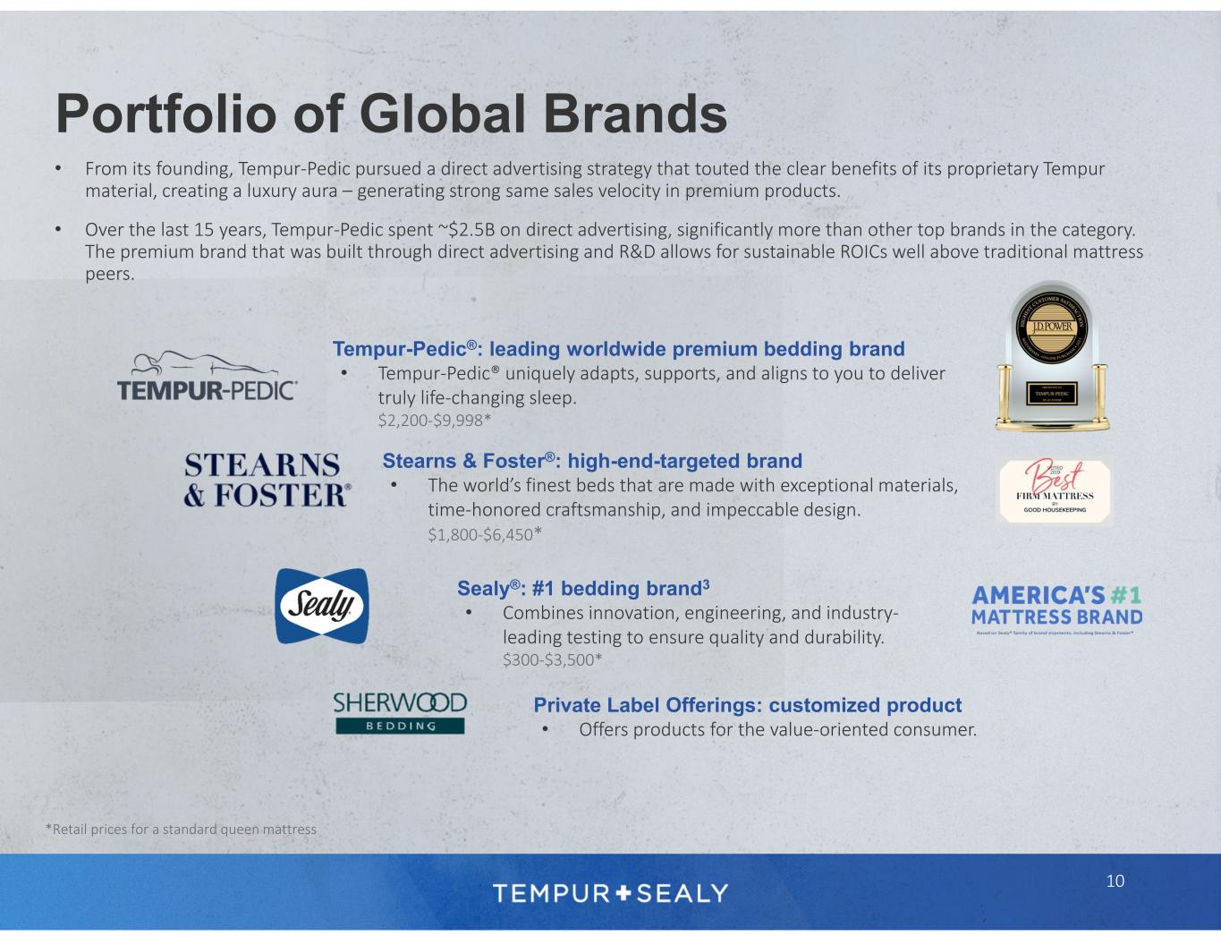 Tempur-Pedic®: leading worldwide premium bedding brand • Tempur‐Pedic® uniquely adapts, supports, and aligns to you to deliver  truly life‐changing sleep. $2,200‐$9,998* Stearns & Foster®: high-end-targeted brand • The world’s finest beds that are made with exceptional materials,  time‐honored craftsmanship, and impeccable design. $1,800‐$6,450* Sealy®: #1 bedding brand3 • Combines innovation, engineering, and industry‐ leading testing to ensure quality and durability. $300‐$3,500* Private Label Offerings: customized product • Offers products for the value‐oriented consumer. Portfolio of Global Brands 10 • From its founding, Tempur‐Pedic pursued a direct advertising strategy that touted the clear benefits of its proprietary Tempur  material, creating a luxury aura – generating strong same sales velocity in premium products. • Over the last 15 years, Tempur‐Pedic spent ~$2.5B on direct advertising, significantly more than other top brands in the category.  The premium brand that was built through direct advertising and R&D allows for sustainable ROICs well above traditional mattress peers. *Retail prices for a standard queen mattress