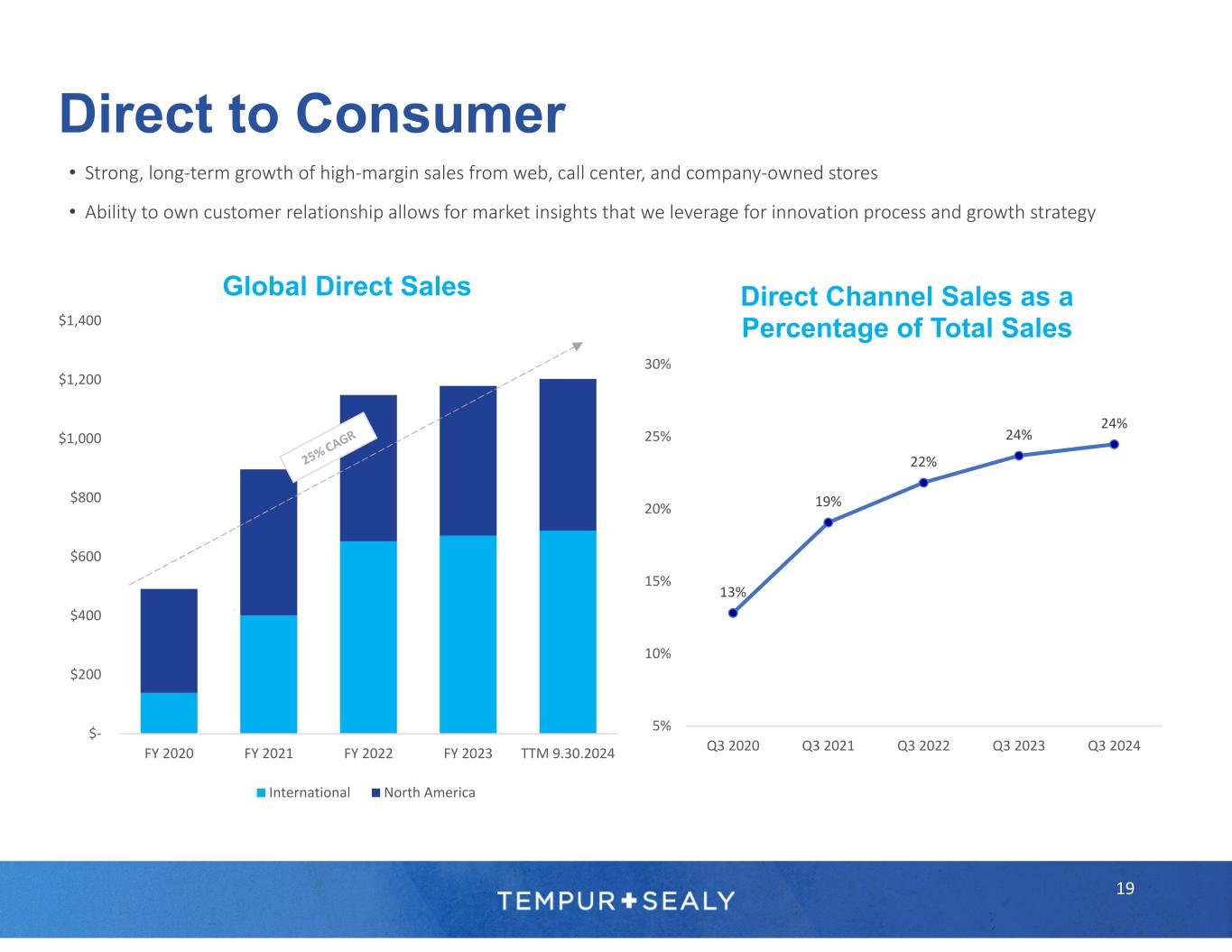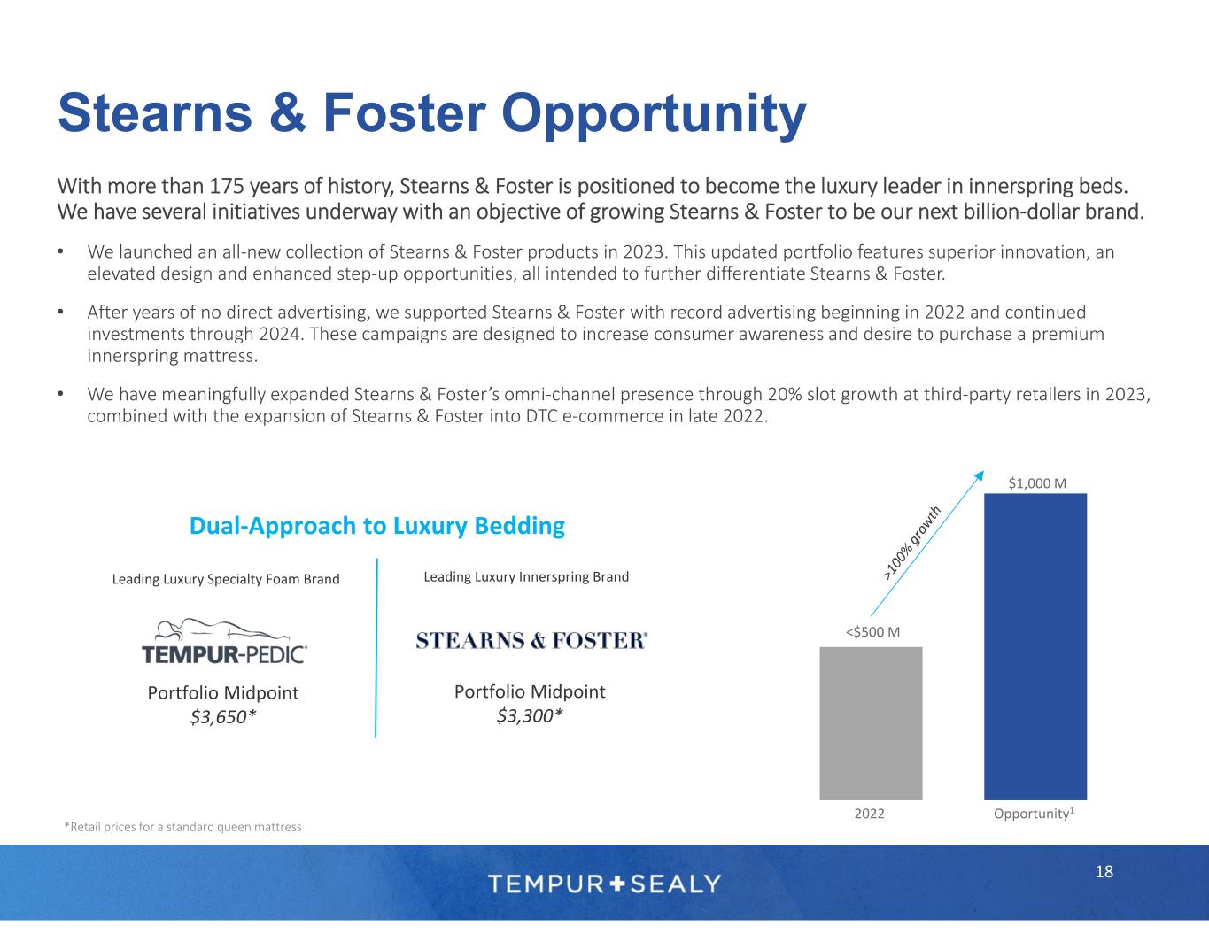 18 With more than 175 years of history, Stearns & Foster is positioned to become the luxury leader in innerspring beds.  We have several initiatives underway with an objective of growing Stearns & Foster to be our next billion‐dollar brand. • We launched an all‐new collection of Stearns & Foster products in 2023. This updated portfolio features superior innovation, an  elevated design and enhanced step‐up opportunities, all intended to further differentiate Stearns & Foster. • After years of no direct advertising, we supported Stearns & Foster with record advertising beginning in 2022 and continued  investments through 2024. These campaigns are designed to increase consumer awareness and desire to purchase a premium  innerspring mattress. • We have meaningfully expanded Stearns & Foster’s omni‐channel presence through 20% slot growth at third‐party retailers in 2023, combined with the expansion of Stearns & Foster into DTC e‐commerce in late 2022. Stearns & Foster Opportunity Dual‐Approach to Luxury Bedding Leading Luxury Specialty Foam Brand Portfolio Midpoint $3,650* Leading Luxury Innerspring Brand Portfolio Midpoint $3,300* <$500 M $1,000 M 2022 Opportunity1 *Retail prices for a standard queen mattress