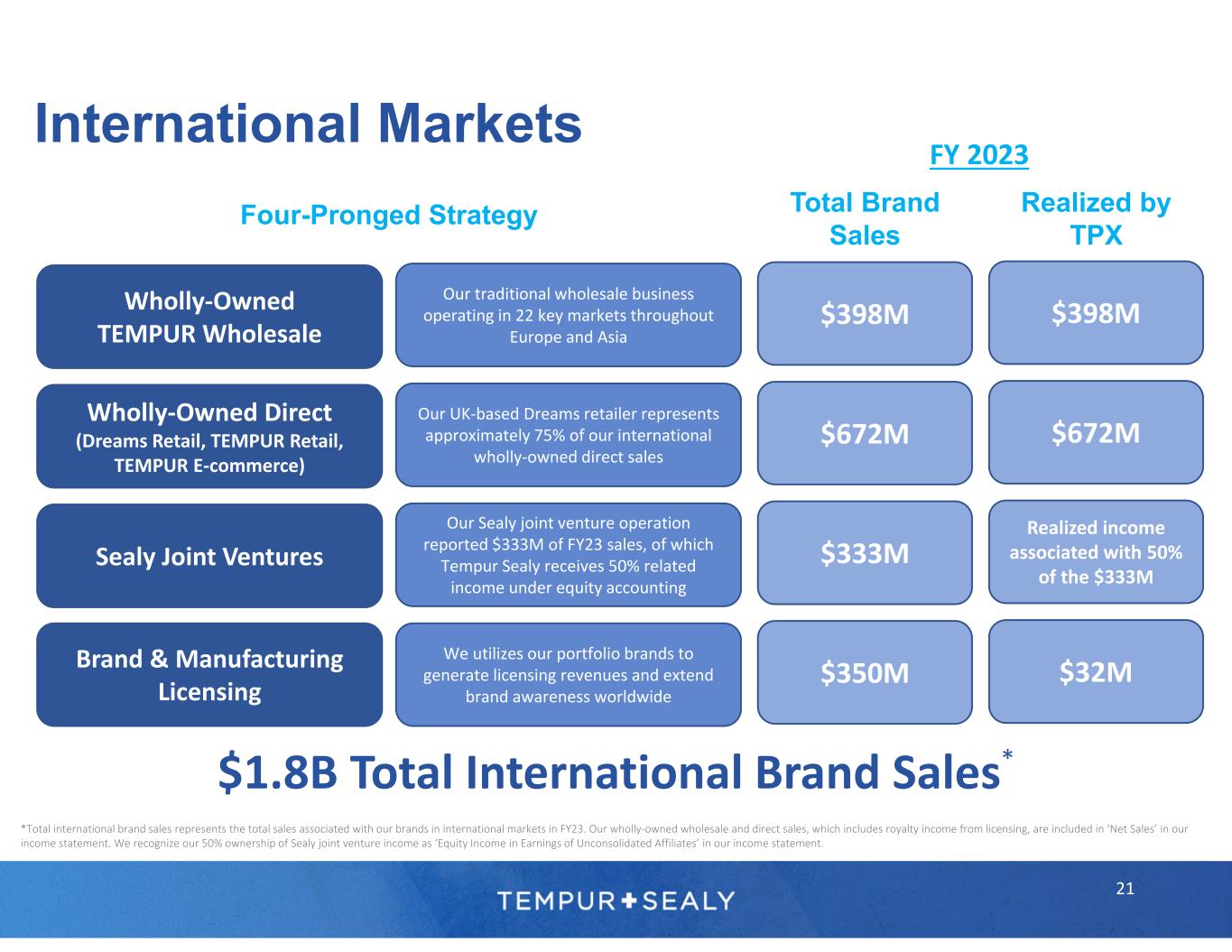 21 International Markets Total Brand Sales $398M $672M Four-Pronged Strategy $333M $350M Wholly‐Owned  TEMPUR Wholesale Brand & Manufacturing  Licensing Wholly‐Owned Direct  (Dreams Retail, TEMPUR Retail,  TEMPUR E‐commerce) Sealy Joint Ventures Our traditional wholesale business  operating in 22 key markets throughout  Europe and Asia Our UK‐based Dreams retailer represents  approximately 75% of our international  wholly‐owned direct sales Our Sealy joint venture operation  reported $333M of FY23 sales, of which  Tempur Sealy receives 50% related  income under equity accounting We utilizes our portfolio brands to  generate licensing revenues and extend  brand awareness worldwide $1.8B Total International Brand Sales* *Total international brand sales represents the total sales associated with our brands in international markets in FY23. Our wholly‐owned wholesale and direct sales, which includes royalty income from licensing, are included in ‘Net Sales’ in our  income statement. We recognize our 50% ownership of Sealy joint venture income as ‘Equity Income in Earnings of Unconsolidated Affiliates’ in our income statement.  $398M $672M Realized income  associated with 50%  of the $333M $32M Realized by TPX FY 2023