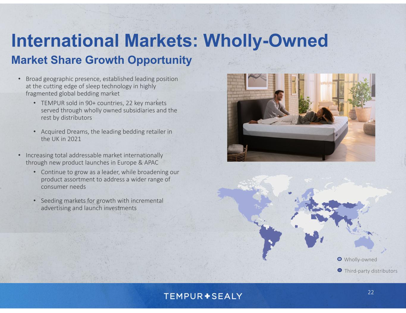 • Broad geographic presence, established leading position  at the cutting edge of sleep technology in highly  fragmented global bedding market • TEMPUR sold in 90+ countries, 22 key markets  served through wholly owned subsidiaries and the  rest by distributors • Acquired Dreams, the leading bedding retailer in  the UK in 2021 • Increasing total addressable market internationally  through new product launches in Europe & APAC  • Continue to grow as a leader, while broadening our  product assortment to address a wider range of  consumer needs  • Seeding markets for growth with incremental  advertising and launch investments 22 Wholly‐owned Third‐party distributors  International Markets: Wholly-Owned Market Share Growth Opportunity