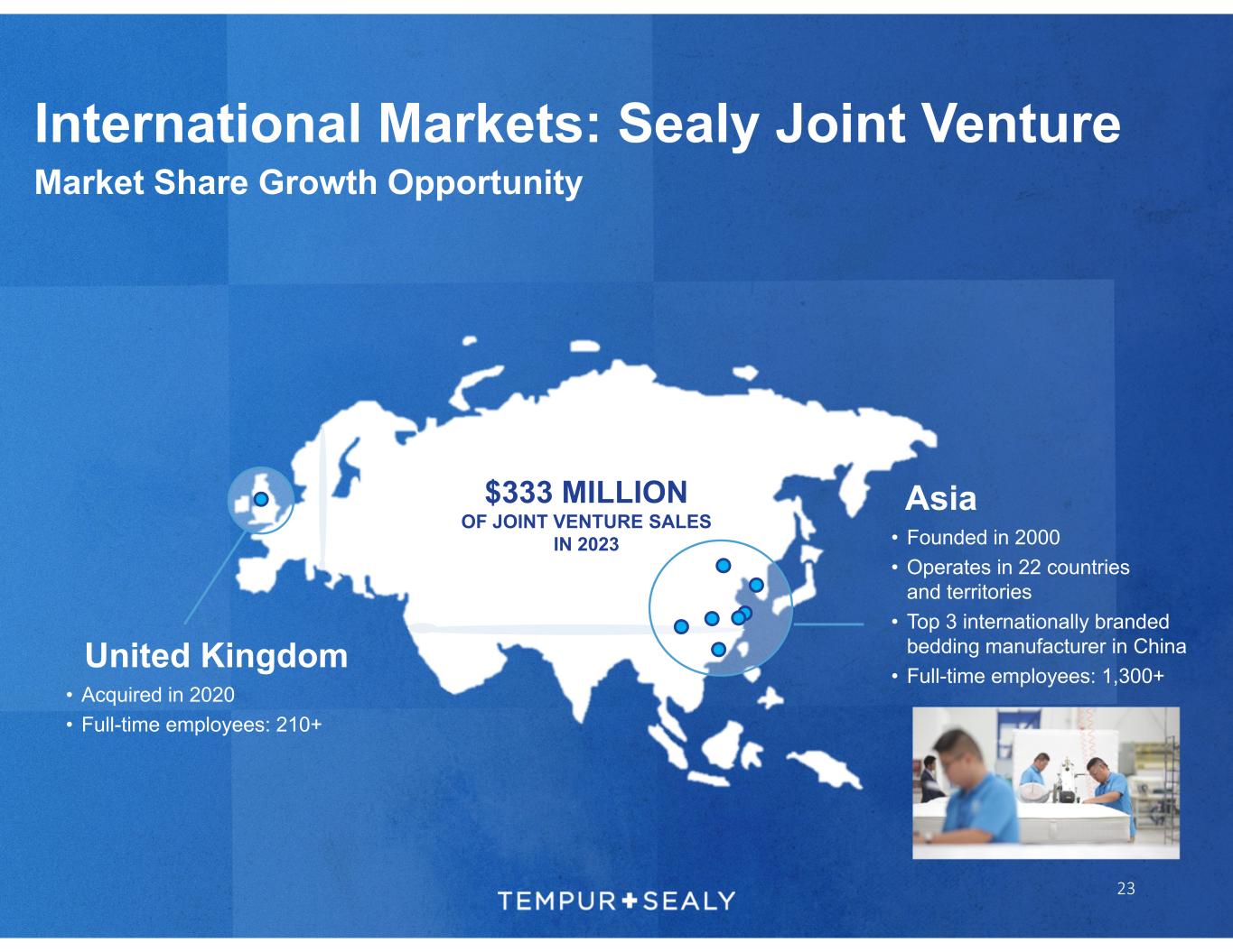 • Founded in 2000 • Operates in 22 countries and territories • Top 3 internationally branded bedding manufacturer in China • Full-time employees: 1,300+ Asia • Acquired in 2020 • Full-time employees: 210+ United Kingdom $333 MILLION OF JOINT VENTURE SALES IN 2023 23 International Markets: Sealy Joint Venture Market Share Growth Opportunity