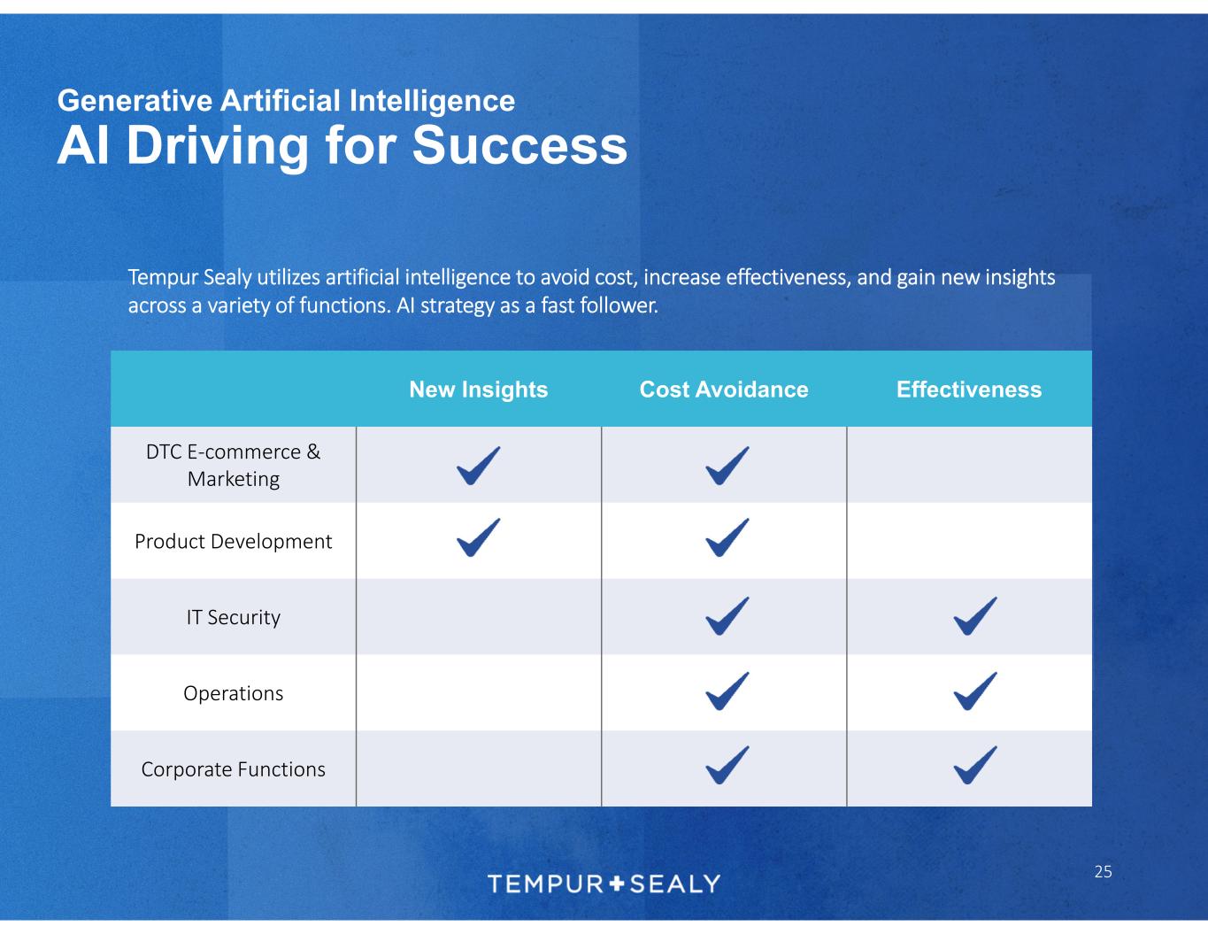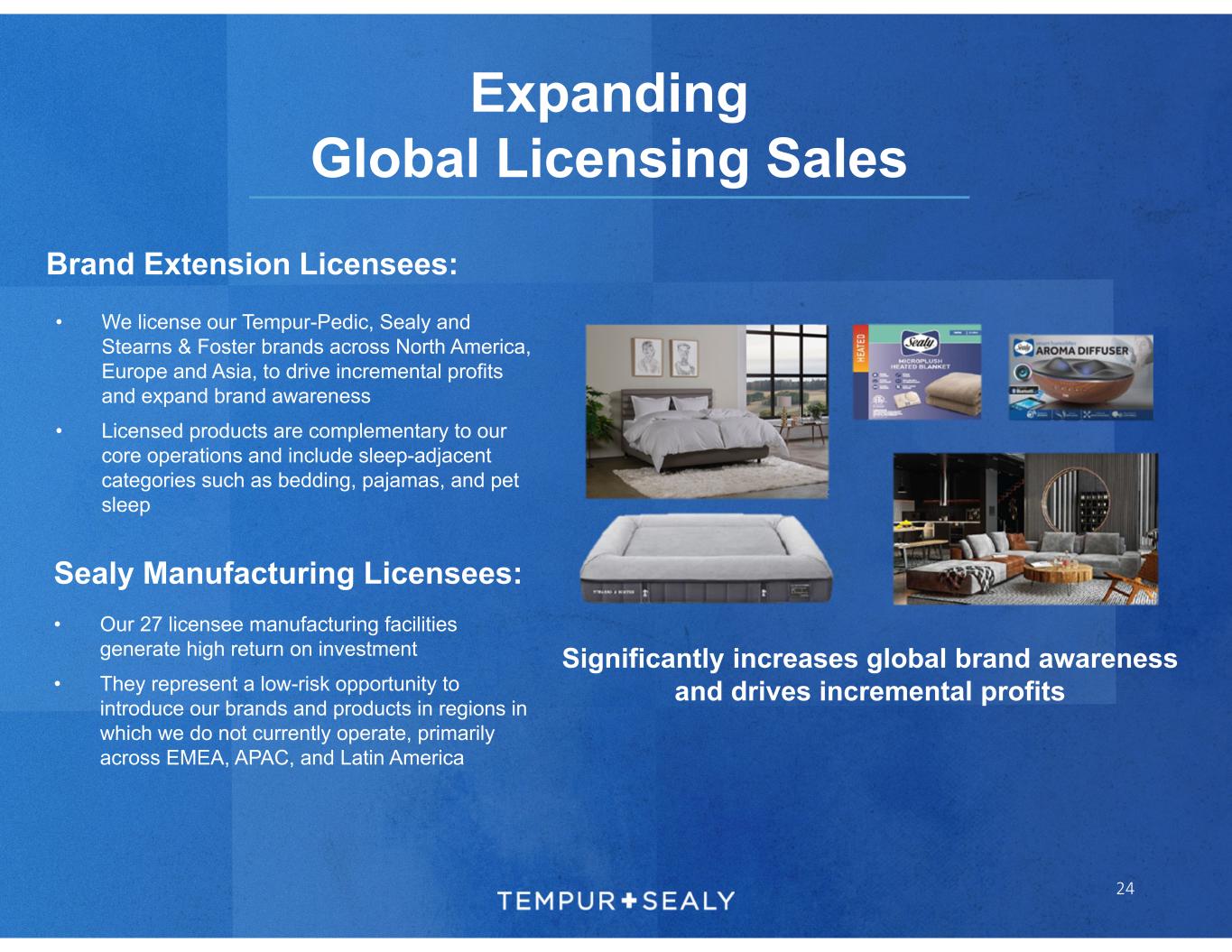 Expanding Global Licensing Sales Sealy Manufacturing Licensees: • Our 27 licensee manufacturing facilities generate high return on investment • They represent a low-risk opportunity to introduce our brands and products in regions in which we do not currently operate, primarily across EMEA, APAC, and Latin America Brand Extension Licensees: • We license our Tempur-Pedic, Sealy and Stearns & Foster brands across North America, Europe and Asia, to drive incremental profits and expand brand awareness • Licensed products are complementary to our core operations and include sleep-adjacent categories such as bedding, pajamas, and pet sleep 24 Significantly increases global brand awareness and drives incremental profits