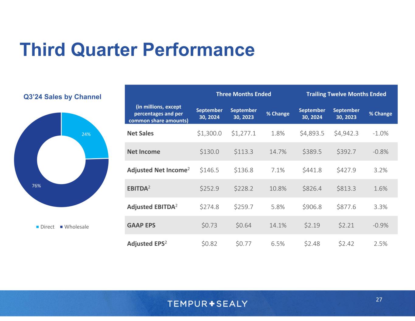 Trailing Twelve Months EndedThree Months Ended % ChangeSeptember  30, 2023 September  30, 2024% ChangeSeptember  30, 2023 September  30, 2024 (in millions, except  percentages and per  common share amounts) ‐1.0%$4,942.3$4,893.51.8%$1,277.1$1,300.0Net Sales ‐0.8%$392.7$389.514.7%$113.3$130.0Net Income 3.2%$427.9$441.87.1%$136.8$146.5Adjusted Net Income2 1.6%$813.3$826.410.8%$228.2$252.9EBITDA2 3.3%$877.6$906.85.8%$259.7$274.8Adjusted EBITDA2 ‐0.9%$2.21$2.1914.1%$0.64$0.73GAAP EPS 2.5%$2.42$2.486.5%$0.77$0.82Adjusted EPS2 Third Quarter Performance 27 Q3’24 Sales by Channel 24% 76% Direct Wholesale