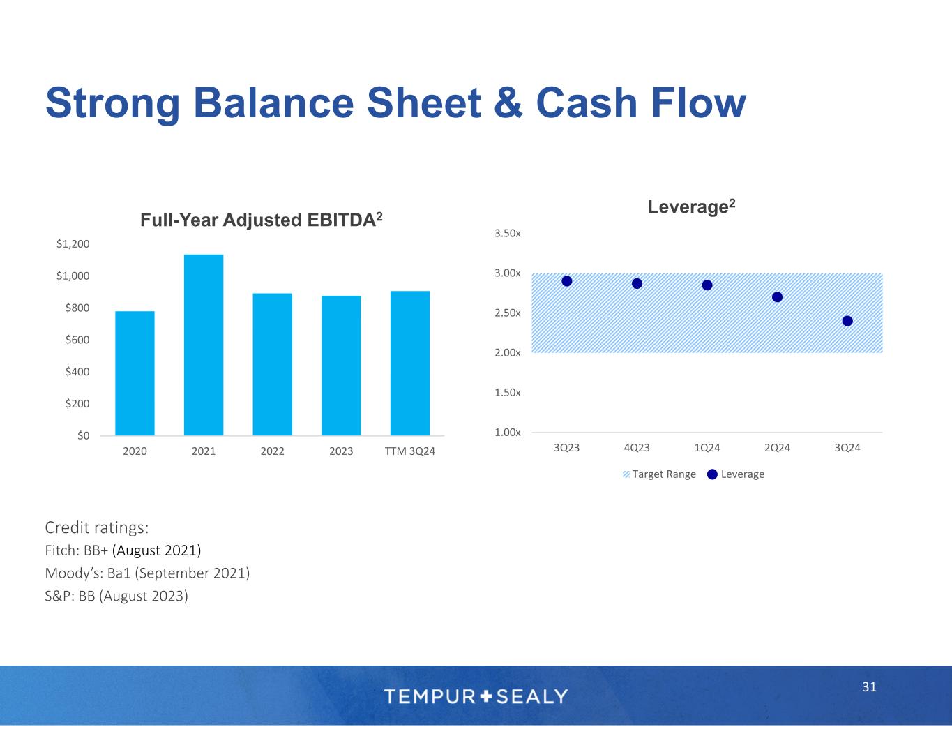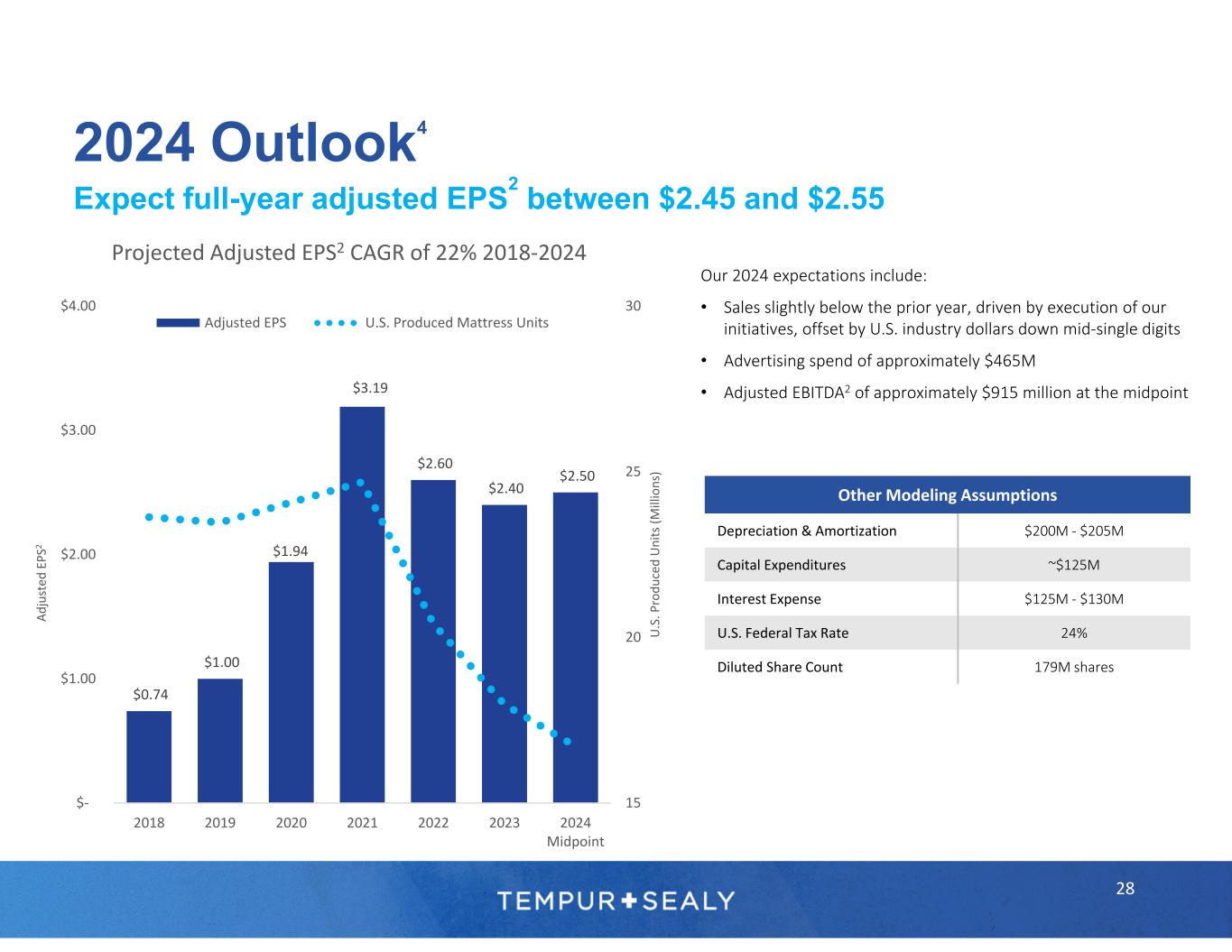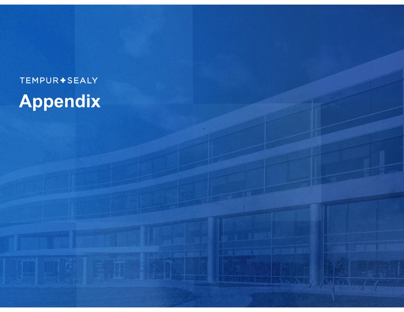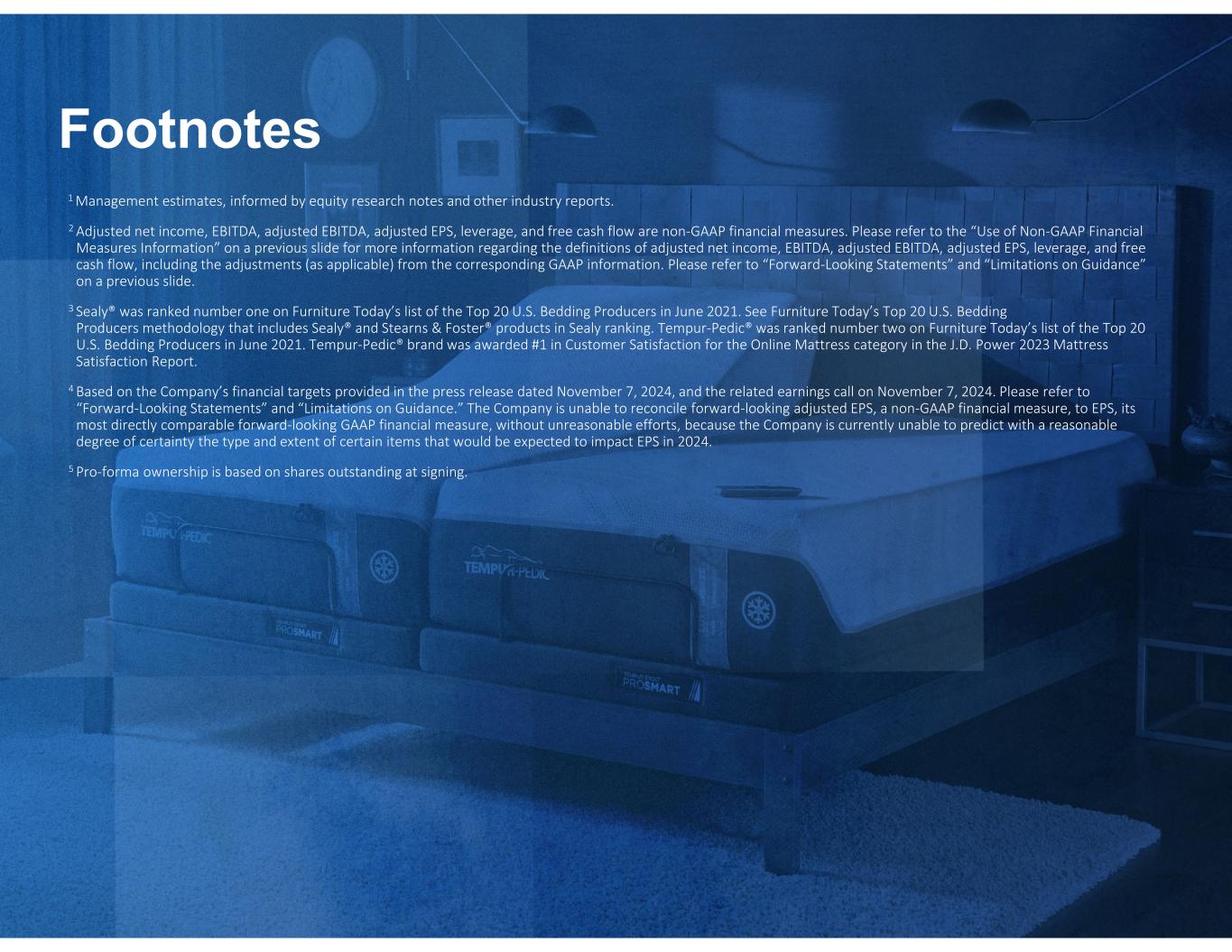 1 Management estimates, informed by equity research notes and other industry reports. 2 Adjusted net income, EBITDA, adjusted EBITDA, adjusted EPS, leverage, and free cash flow are non‐GAAP financial measures. Please refer to the “Use of Non‐GAAP Financial  Measures Information” on a previous slide for more information regarding the definitions of adjusted net income, EBITDA, adjusted EBITDA, adjusted EPS, leverage, and free  cash flow, including the adjustments (as applicable) from the corresponding GAAP information. Please refer to “Forward‐Looking Statements” and “Limitations on Guidance”  on a previous slide.  3 Sealy® was ranked number one on Furniture Today’s list of the Top 20 U.S. Bedding Producers in June 2021. See Furniture Today’s Top 20 U.S. Bedding  Producers methodology that includes Sealy® and Stearns & Foster® products in Sealy ranking. Tempur‐Pedic® was ranked number two on Furniture Today’s list of the Top 20  U.S. Bedding Producers in June 2021. Tempur‐Pedic® brand was awarded #1 in Customer Satisfaction for the Online Mattress category in the J.D. Power 2023 Mattress  Satisfaction Report. 4 Based on the Company’s financial targets provided in the press release dated November 7, 2024, and the related earnings call on November 7, 2024. Please refer to  “Forward‐Looking Statements” and “Limitations on Guidance.” The Company is unable to reconcile forward‐looking adjusted EPS, a non‐GAAP financial measure, to EPS, its  most directly comparable forward‐looking GAAP financial measure, without unreasonable efforts, because the Company is currently unable to predict with a reasonable  degree of certainty the type and extent of certain items that would be expected to impact EPS in 2024. 5 Pro‐forma ownership is based on shares outstanding at signing. Footnotes
