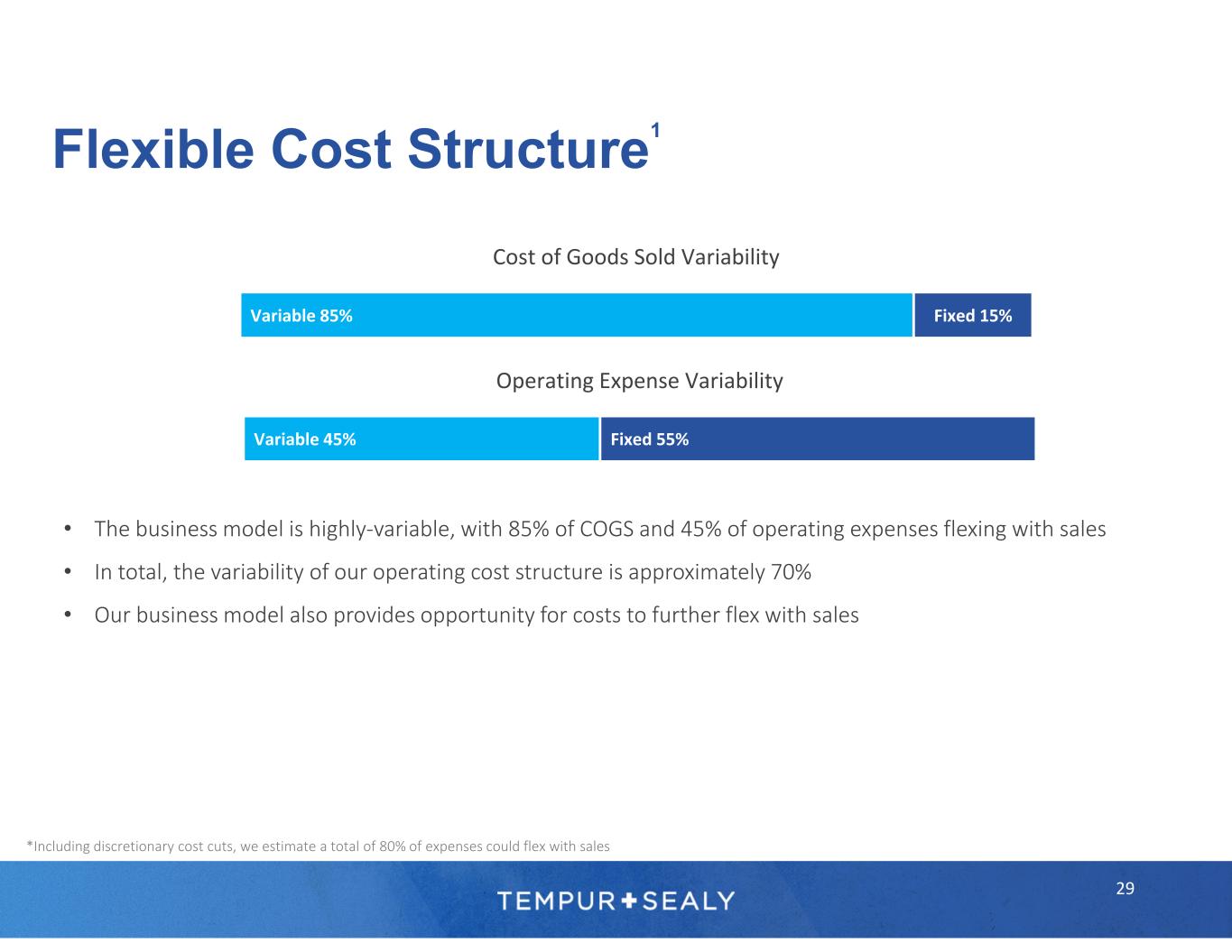 Flexible Cost Structure1 29 • The business model is highly‐variable, with 85% of COGS and 45% of operating expenses flexing with sales • In total, the variability of our operating cost structure is approximately 70% • Our business model also provides opportunity for costs to further flex with sales Variable 85% Fixed 15% Cost of Goods Sold Variability Variable 45% Fixed 55% Operating Expense Variability *Including discretionary cost cuts, we estimate a total of 80% of expenses could flex with sales