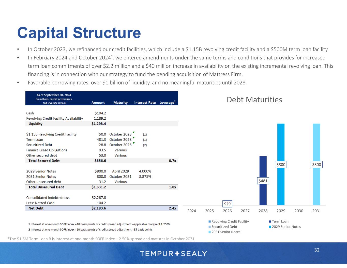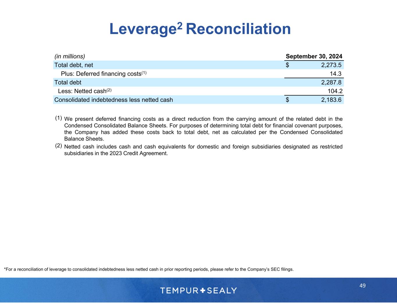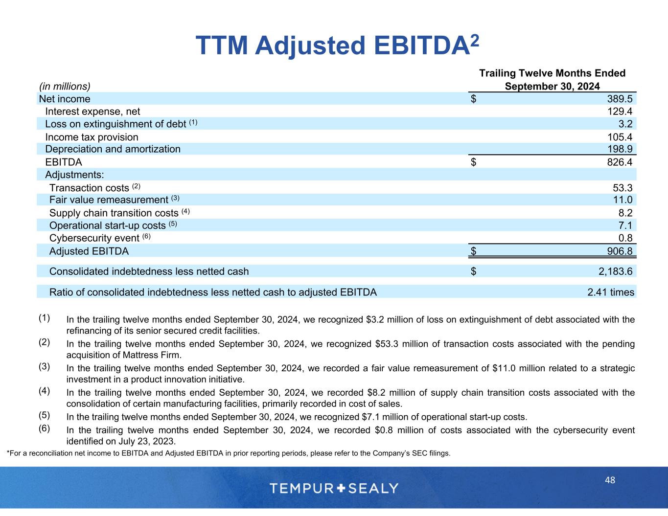 48 TTM Adjusted EBITDA2 *For a reconciliation net income to EBITDA and Adjusted EBITDA in prior reporting periods, please refer to the Company’s SEC filings. Trailing Twelve Months Ended September 30, 2024(in millions) $ 389.5Net income 129.4Interest expense, net 3.2Loss on extinguishment of debt (1) 105.4Income tax provision 198.9Depreciation and amortization $ 826.4EBITDA Adjustments: 53.3Transaction costs (2) 11.0Fair value remeasurement (3) 8.2Supply chain transition costs (4) 7.1Operational start-up costs (5) 0.8Cybersecurity event (6) $ 906.8Adjusted EBITDA $ 2,183.6Consolidated indebtedness less netted cash 2.41 timesRatio of consolidated indebtedness less netted cash to adjusted EBITDA In the trailing twelve months ended September 30, 2024, we recognized $3.2 million of loss on extinguishment of debt associated with the refinancing of its senior secured credit facilities. (1) In the trailing twelve months ended September 30, 2024, we recognized $53.3 million of transaction costs associated with the pending acquisition of Mattress Firm. (2) In the trailing twelve months ended September 30, 2024, we recorded a fair value remeasurement of $11.0 million related to a strategic investment in a product innovation initiative. (3) In the trailing twelve months ended September 30, 2024, we recorded $8.2 million of supply chain transition costs associated with the consolidation of certain manufacturing facilities, primarily recorded in cost of sales. (4) In the trailing twelve months ended September 30, 2024, we recognized $7.1 million of operational start-up costs.(5) In the trailing twelve months ended September 30, 2024, we recorded $0.8 million of costs associated with the cybersecurity event identified on July 23, 2023. (6)