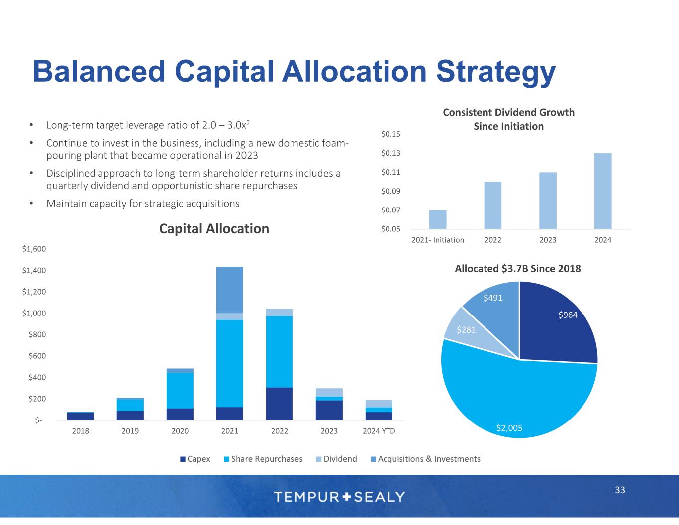 • Long‐term target leverage ratio of 2.0 – 3.0x2 • Continue to invest in the business, including a new domestic foam‐ pouring plant that became operational in 2023 • Disciplined approach to long‐term shareholder returns includes a  quarterly dividend and opportunistic share repurchases • Maintain capacity for strategic acquisitions  Balanced Capital Allocation Strategy 33  $0.05  $0.07  $0.09  $0.11  $0.13  $0.15 2021‐ Initiation 2022 2023 2024 Consistent Dividend Growth  Since Initiation $964  $2,005  $281  $491  Allocated $3.7B Since 2018  $‐  $200  $400  $600  $800  $1,000  $1,200  $1,400  $1,600 2018 2019 2020 2021 2022 2023 2024 YTD Capital Allocation